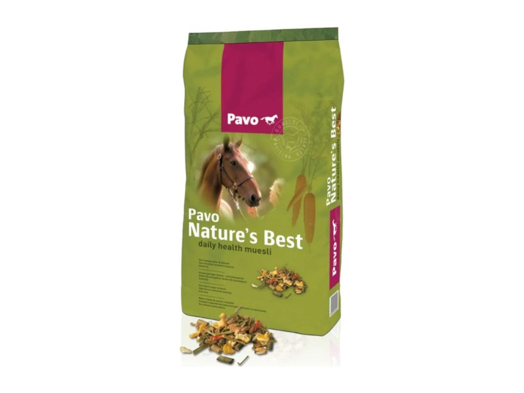 Pavo Nature´s Best je extrémně chutné na strukturu bohaté muesli s kousky mrkve, pšenicí špaldou a na slunci sušenou vojtěškou. Tyto složky v Pavo Nature´s Best stimulují přirozené žvýkání vašeho koně nebo pony. Je to kompletní (ve smyslu obsahuje vše potřebné) doplňkové (ve smyslu doplněk k objemnému krmivu) energetické krmivo s optimálním složením přírodních složek, vitaminů, mikroprvků a minerálních látek. Pavo Nature´s Best neobsahuje oves, má velmi nízký obsah dusíkatých látek a není přidaný cukr, protože neobsahuje melasu. Proto je Pavo Nature´s Best velmi vhodné pro koně, kteří mají přirozeně „horkou hlavu“ nebo pro koně a pony, kteří mají sklon ke schvácení kopyt.