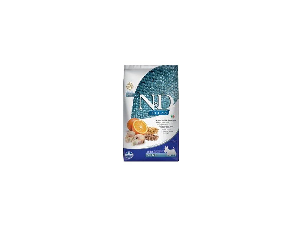 N&D OCEAN Codfish, Spelt, Oats & Orange Adult Mini DogTreska, špalda, oves a pomeranč.