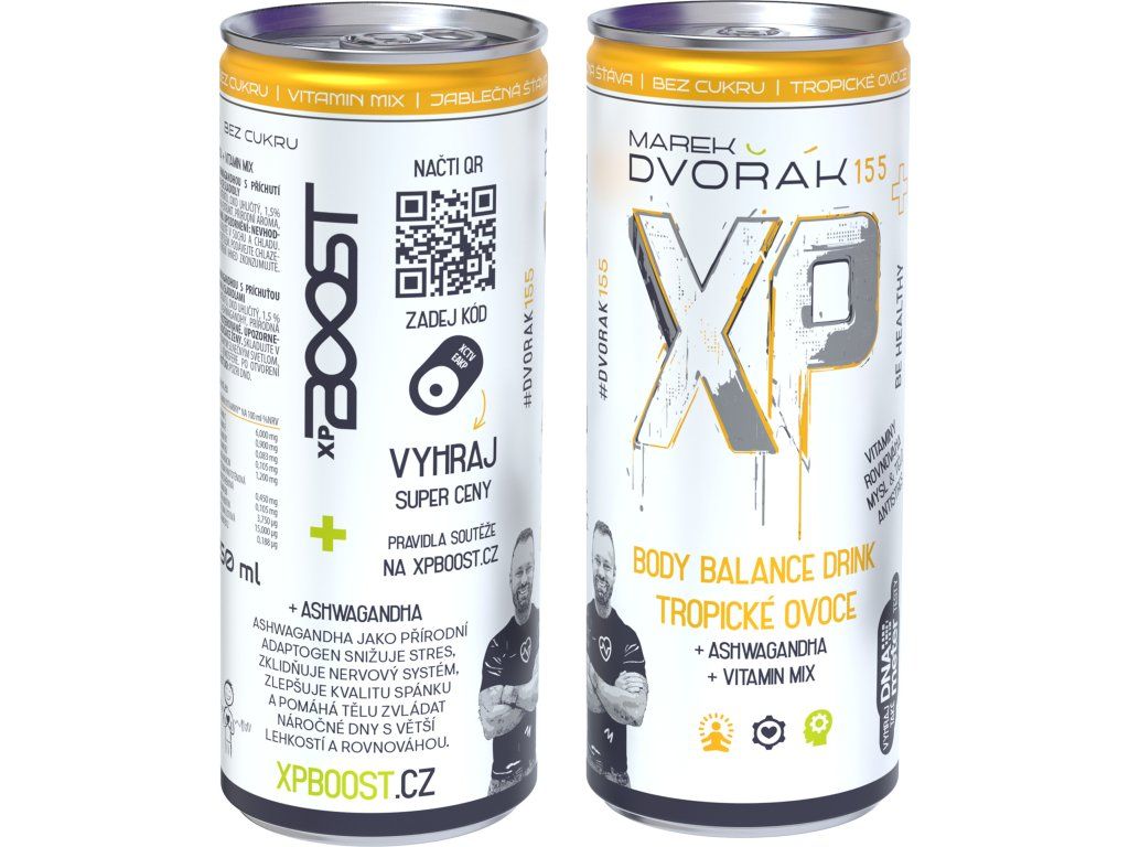 Jemně sycený nealkoholický nápoj s příchutí tropického ovoce, ashwagandhou, vitaminy a sladidly. Chceš boostovat a levelovat? Při nákupu produktů XP BOOST lze využít promo kód z plechovky v rámci soutěže pořádané výrobcem. Podrobnosti a pravidla akce jsou dostupné na www.xpboost.cz.