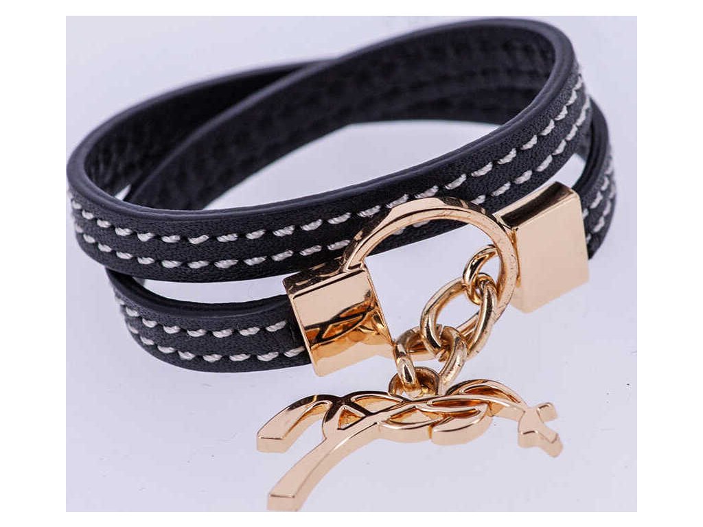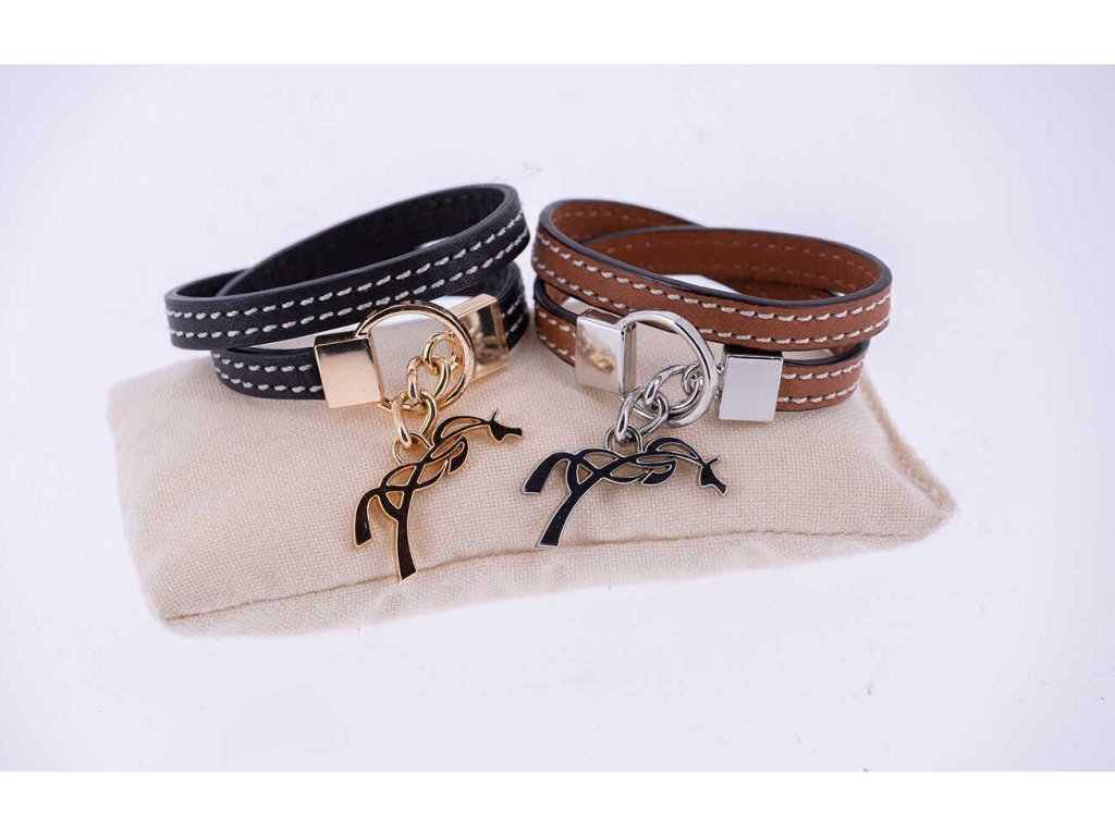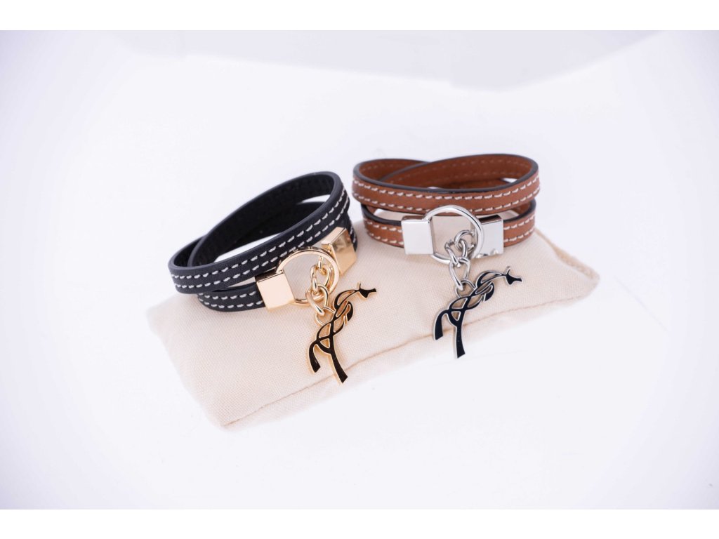 Elegantní kožený náramek Signature s bílým prošíváním, který se dvakrát obtáčí kolem zápěstí. Je nastavitelný a zapíná se pomocí přívěsku s logem Penelope. Černá kůže je doplněná kovovými prvky ve zlaté barvě.