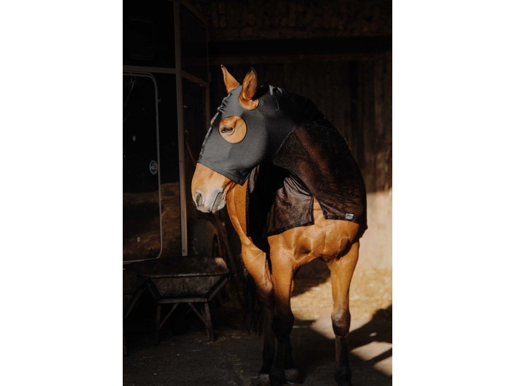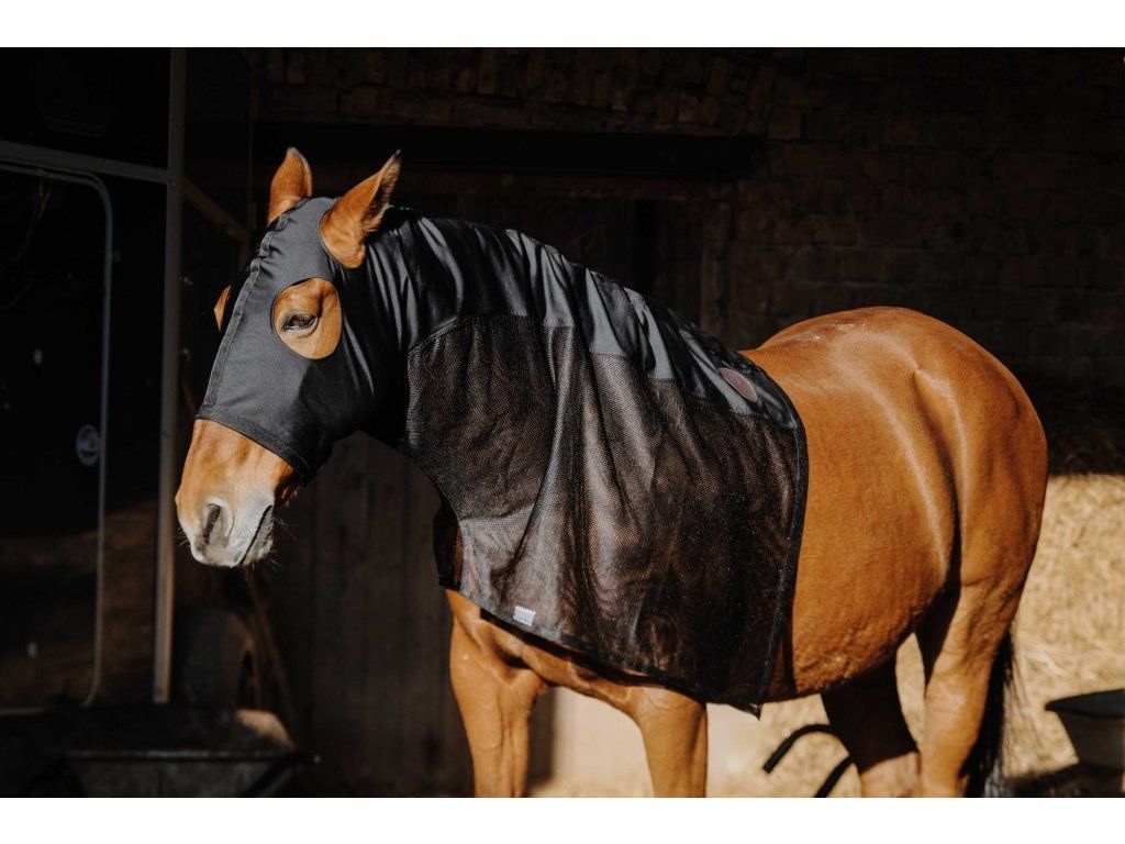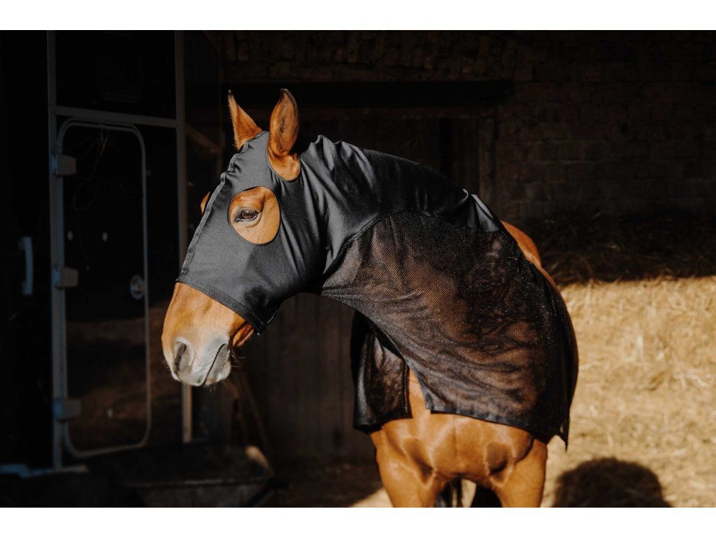 Síťovaný návlek pro koně poskytuje spolehlivou ochranu proti dotěrnému hmyzu. Je vyroben z vysoce kvalitního a prodyšného materiálu s vyztužením podél páteře pro lepší stabilitu. Pružný lem v oblasti krku zajišťuje pohodlné a bezpečné usazení. Součástí návleku je elastická maska s prostorem pro oči a uši. Návlek se snadno navléká přes hlavu koně.