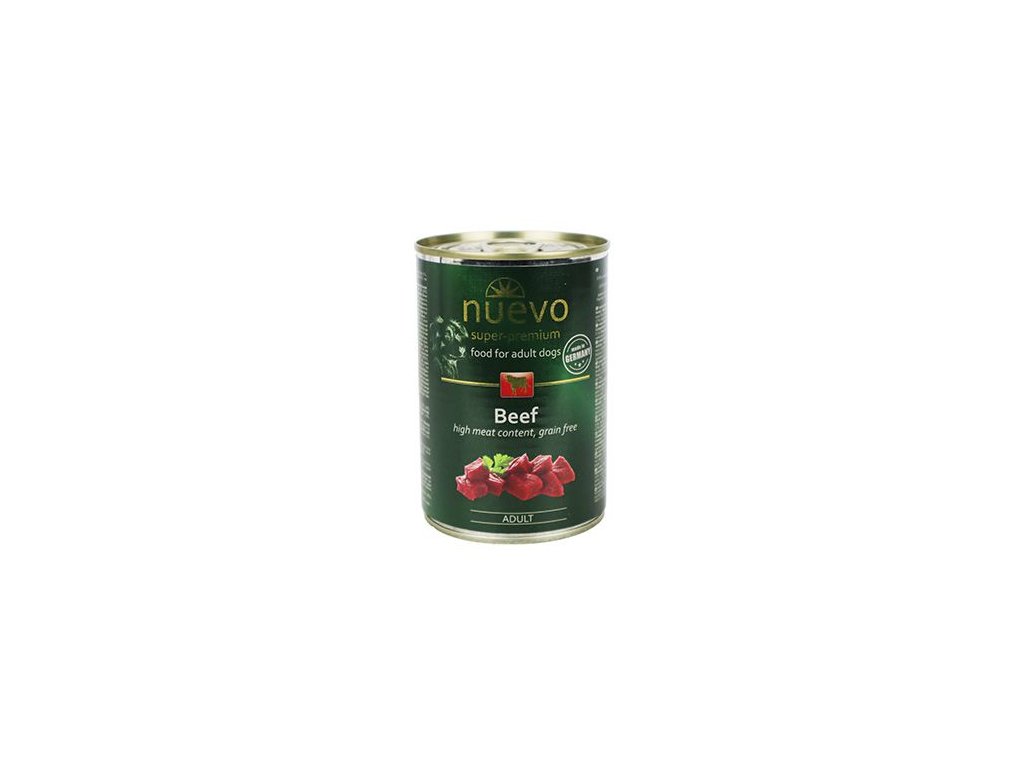 Konzerva Nuevo Hovězí je vhodná pro dospělé psy všech plemen, s obsahem hovězího masa. Vysoký podíl masa (72%) obsahuje velké množství cenných bílkovin. Esenciální látky, vitamíny, minerály a další výživné látky vytvářejí dokonale vyváženou, komplexní stravu, kterou si i ten nejmlsnější a nejvybíravější jedlík okamžitě zamiluje. Krmivo je výborným zdrojem energie, výborně stravitelné a obvzláště chutné.