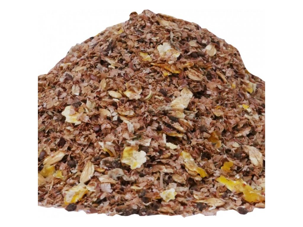Složení: pšeničné otruby, vločkované lněné semeno, vločky ječmene, vločky kukuřice, sušené jablečné výlisky, čekankové řízky, třtinová melasa, uhličitan vápenatý, byliny.