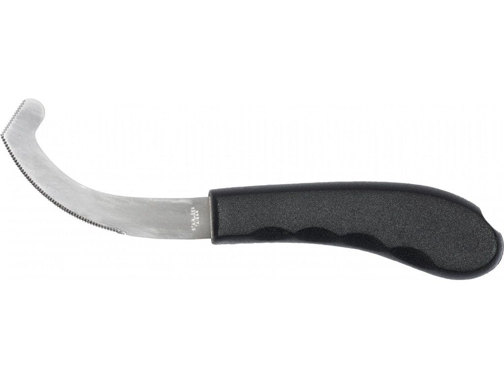 Praktický nůž se zahnutou zubatou čepelí na bezpečné a jednoduché odstranění vajíček střečků z nohou vašeho koně. Tento speciálně tvarovaný nůž je navržen tak, aby se dostal do těžko dostupných oblastí na nohou a kloubech koní i na jiné části těla koně. Tvarovaná rukojeť je z černého plastu.