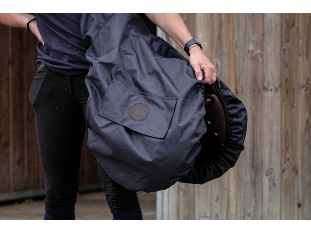 Obal na sedlo je vyroben z nepromokavého a velmi odolného polyesteru 1680D s PVC vrstvou, která zajišťuje dlouhou životnost a ochranu sedla. Silná podšívka z polar fleecu poskytuje optimální ochranu proti poškrábání a oděru. Praktický otvor pod samosvorkou umožňuje ponechat třmeny na sedle i během uskladnění, což usnadňuje manipulaci a zajišťuje pohodlné použití.