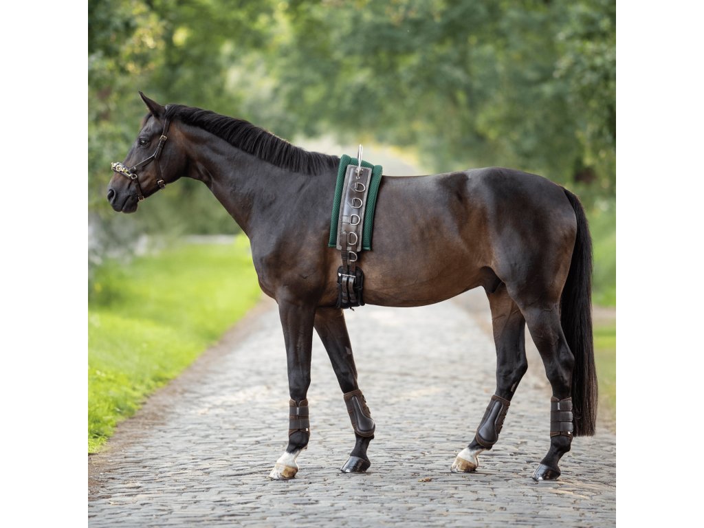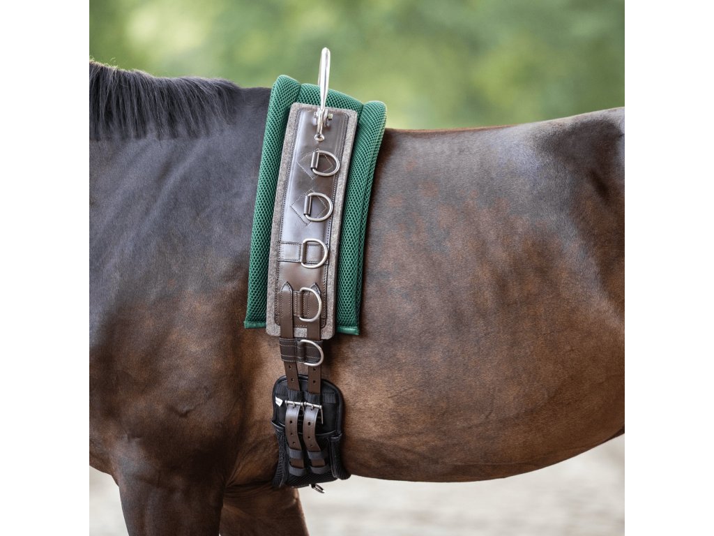Praktický a multifunkční lonžovací obřišník Flex Fit je ideální volbou pro práci ze země. Nabízí široké možnosti využití na lonži a snadno se přizpůsobí různým potřebám jezdce i koně. Je vyroben z robustní kůže a z nerezové oceli, s bočními částmi, jejichž úhel lze individuálně nastavit. Zajišťuje optimální přizpůsobení hrudnímu koši koně, ideální oporu a rozložení tlaku a zároveň bezpečné odlehčení podbřišníku a páteře bez silného polstrování. Klasické obřišníky s mohutným polstrováním mohou mladým nebo méně osvaleným koním nevyhovovat, vychylovat se a způsobovat nepohodlí. Flex Fit obřišník je místo toho polstrován plochými plstěnými podložkami, které lépe drží na místě a zajišťují stabilitu bez nutnosti nadměrného dotahování podbřišníku.