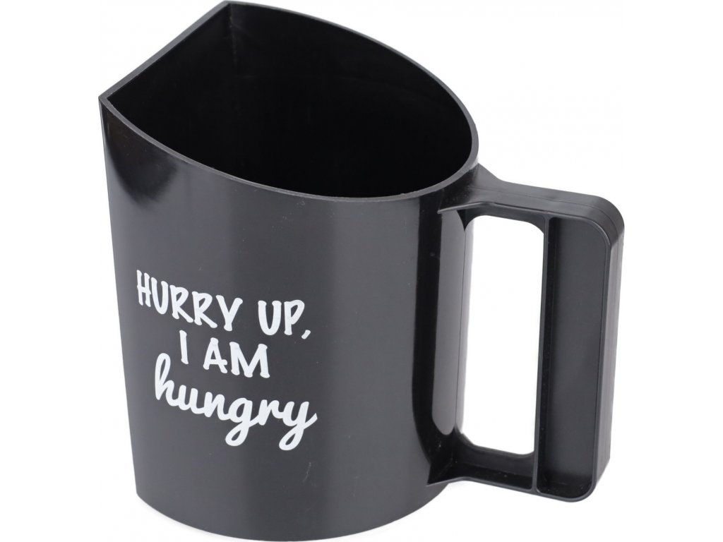 Stylová plastová odměrka na krmivo v módních barvách. Robustní a snadno omyvatelná. Ozvláštněna nápisem Just give me the food. Objem 1,5 l.