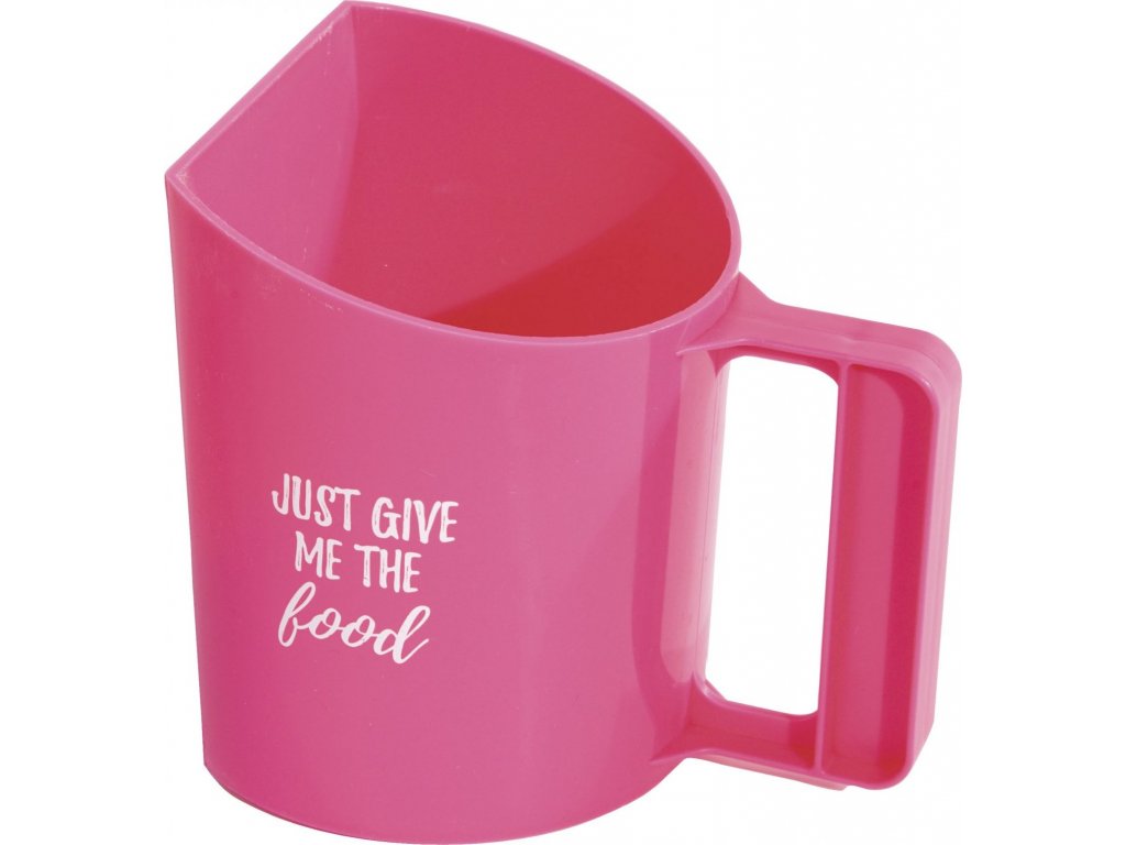 Stylová plastová odměrka na krmivo v módních barvách. Robustní a snadno omyvatelná. Ozvláštněna nápisem Just give me the food. Objem 1,5 l.