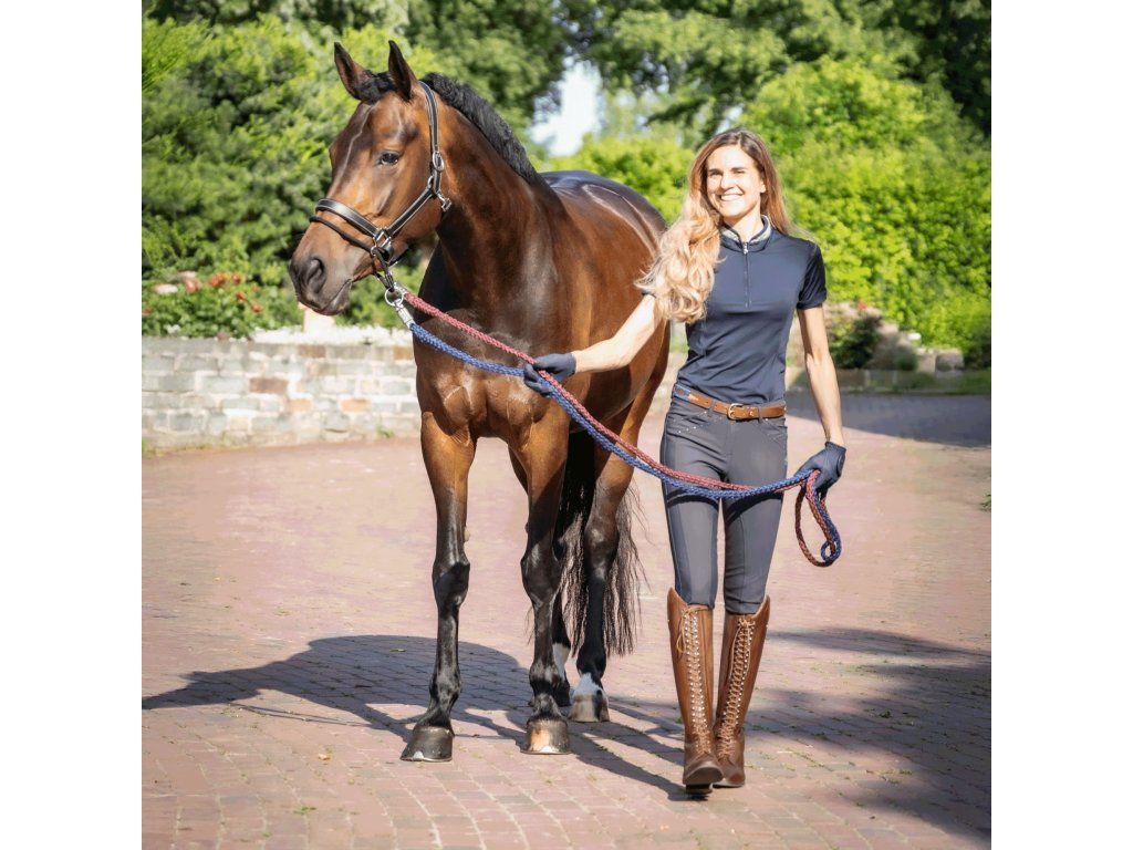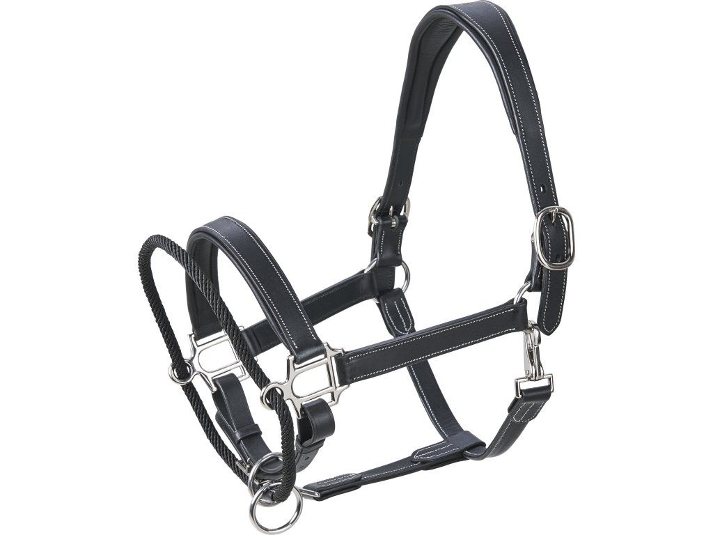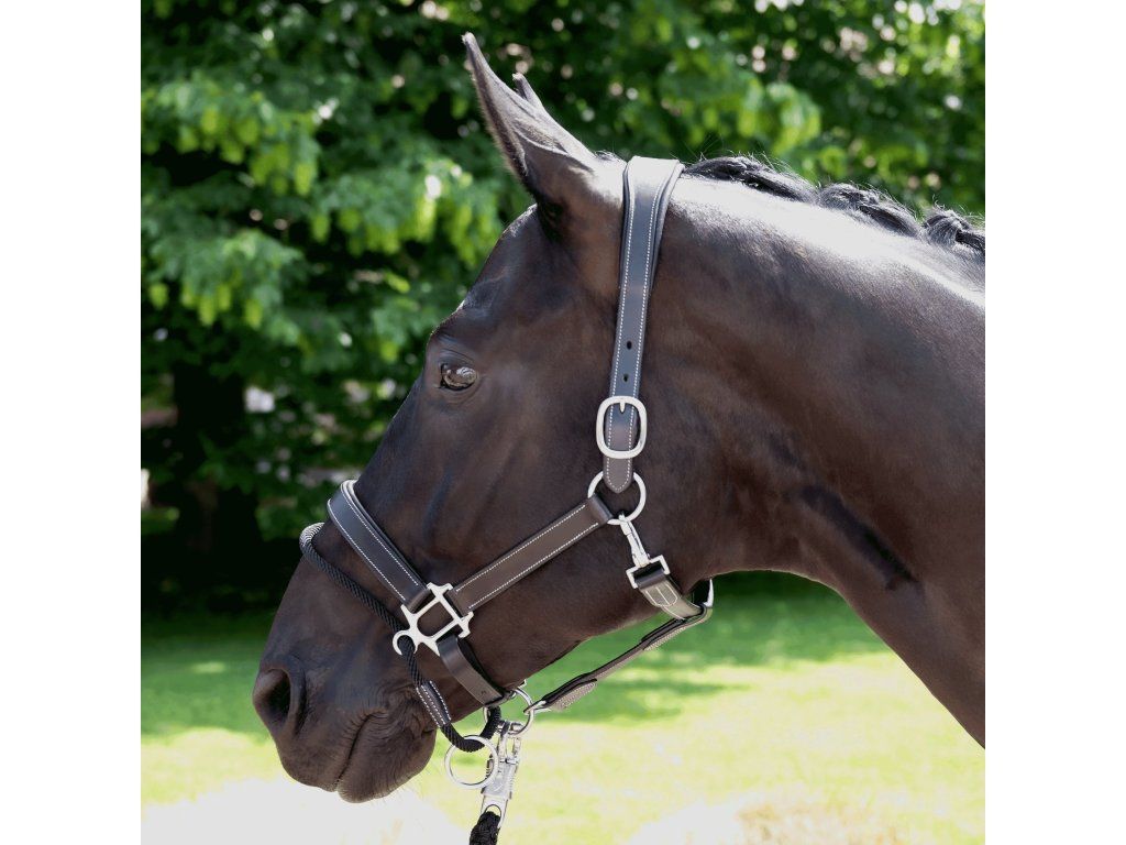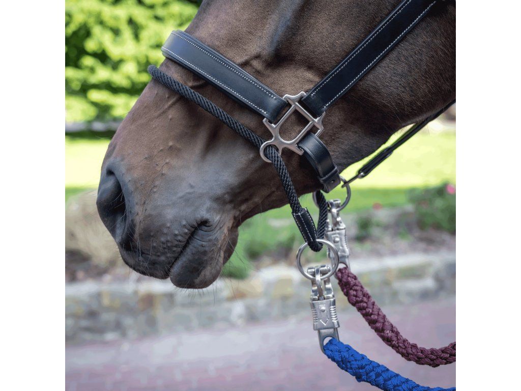 Odolná kožená ohlávka s integrovaným provazem přes nánosník pro přesnější vedení a lepší kontrolu u temperamentních koní. Dva kroužky na připnutí vodítka umožňují snadné přepínání mezi oběma variantami použití. Pro klasickou funkci ohlávky připevněte vodítko ke kroužku na koženém řemínku (tlak se rozkládá běžně přes týl a nosní hřbet). Pro přesnější vedení připněte vodítko na spodní kroužek, který je připojen výhradně ke korekčnímu provazu (ten působí cíleněji na nos a pomáhá udržet lepší kontrolu). Vodítko připnuté pouze na korekční provaz je určeno výhradně pro vodění, nikdy takto koně neuvazujte. Způsob použití vždy volte s rozvahou a podle konkrétní situace.