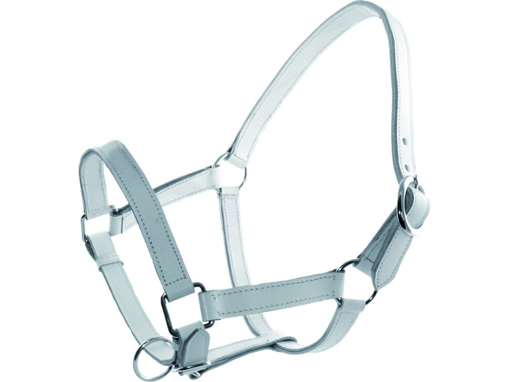 Ohlávka vyrobena z kůže. Nastavitelná v oblasti nátylníku i nánosníku. Vybavena stříbrným kováním. K dispozici v bílé barvě. Vyráběna ve velikostech Pony, Cob, Full a Extra-Full.
