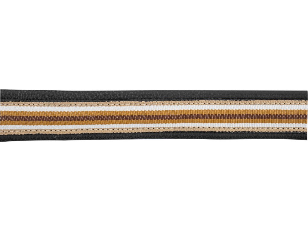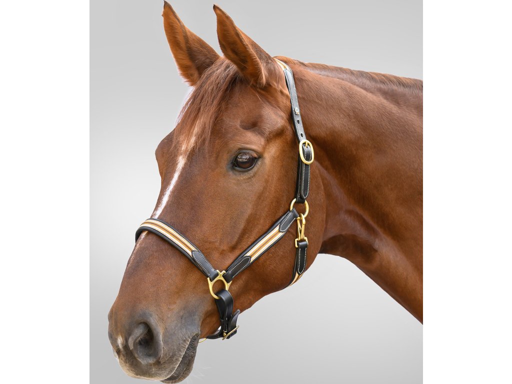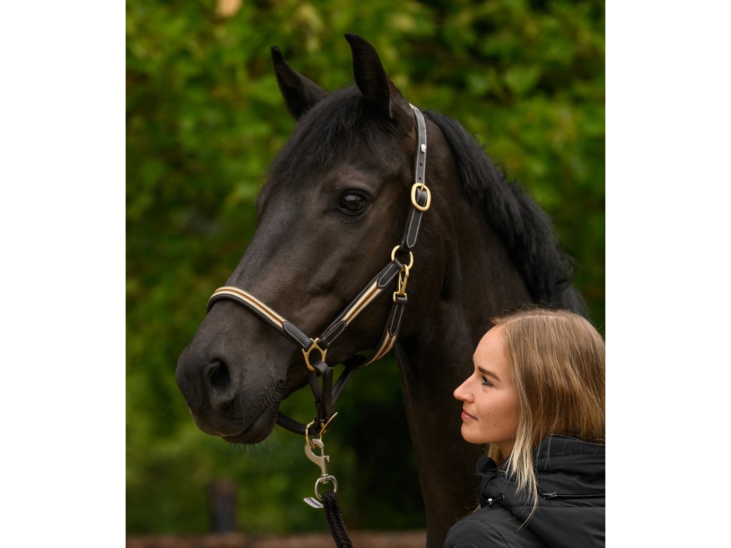 Měkká kožená ohlávka v elegantním provedení, doplněná jemným ozdobným prošíváním a pevnými nylonovými popruhy na nánosníku, podbradním řemínku, nátylníku a lícnicích. Zlaté kovové doplňky podtrhují luxusní charakter ohlávky a zároveň zajišťují dlouhou životnost. Ohlávka umožňuje přesné přizpůsobení díky oboustrannému nastavení na nátylníku a nastavení na nánosníku. Navržena s důrazem na funkčnost a komfort.