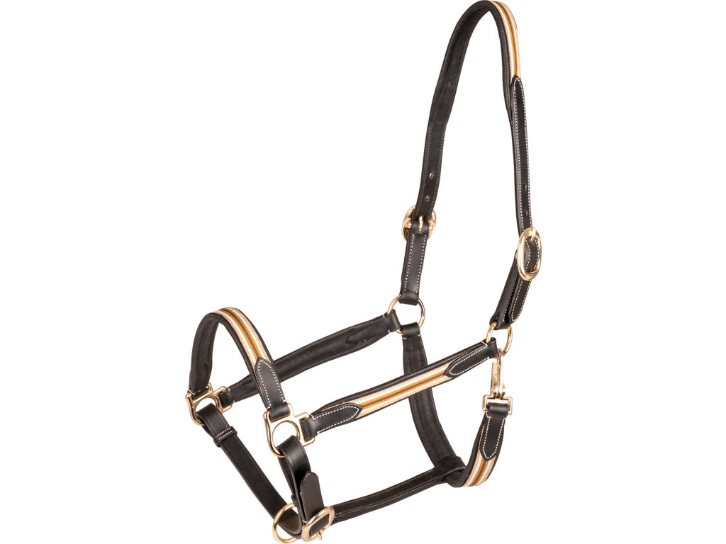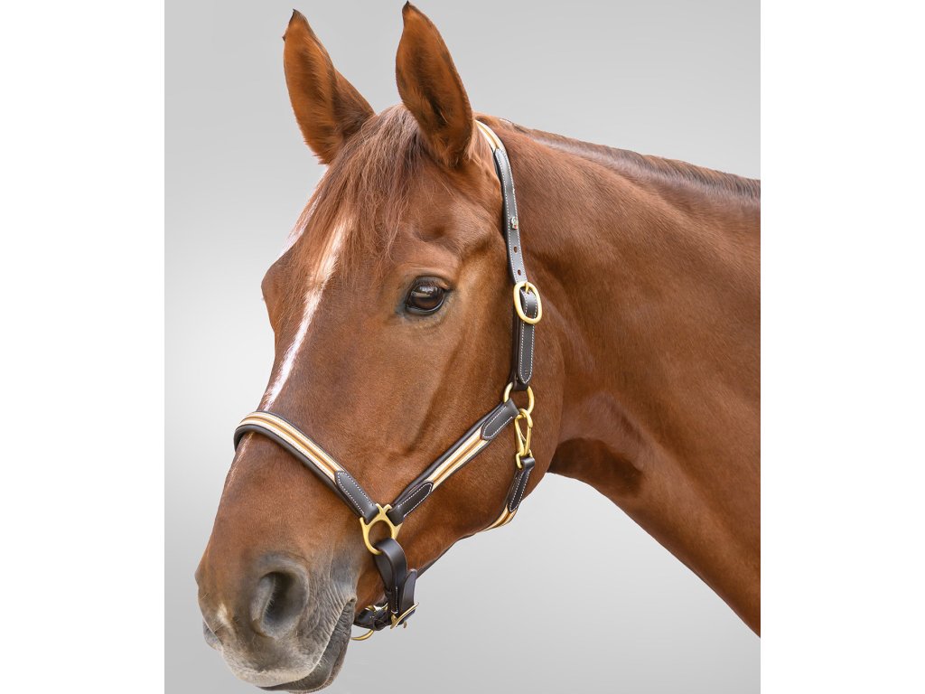 Měkká kožená ohlávka v elegantním provedení, doplněná jemným ozdobným prošíváním a pevnými nylonovými popruhy na nánosníku, podbradním řemínku, nátylníku a lícnicích. Zlaté kovové doplňky podtrhují luxusní charakter ohlávky a zároveň zajišťují dlouhou životnost. Ohlávka umožňuje přesné přizpůsobení díky oboustrannému nastavení na nátylníku a nastavení na nánosníku. Navržena s důrazem na funkčnost a komfort.