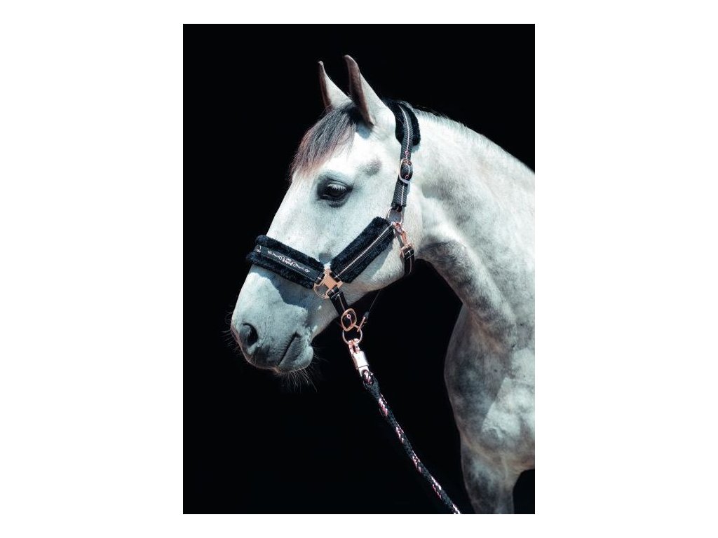 Elegantní a velmi kvalitní ohlávka s kováním v barvě růžového zlata. Nánosník je zdobený výšivkou s logem značky HKM. Ohlávka je opatřena měkkým polstrováním z umělé vlny na nánosníku, nátylníku a lícnicích. Je proto vhodná pro citlivé koně, zajistí optimální pohodlí. Ohlávka je velikostně nastavitelná na obou stranách nátylníku a na nánosníku. Je opatřena klasickou karabinou.
