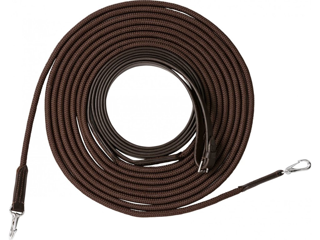 Dlouhé otěže pro práci ze země, z kvalitní buvolí kůže a syntetického materiálu. Umožňují snadné přichycení k udidlu a protažení kroužky obřišníku pro jemné a efektivní vedení...