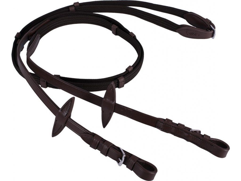 Jednoduché otěže v dobré kvalitě. S koženými konci, koženými zarážkami a s úchyty pro martingal. K dispozici v hnědém a černém provedení. Délka: SHETTY: 110cm, PONY: 125cm, FULL: 140cm.