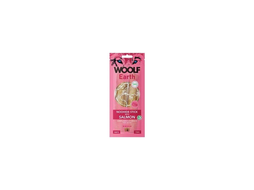 Psí pochoutka ve formě tyčinky je doplněna o maso z lososa. Balení je opatřeno zipem pro případ, že bude potřeba pamlsek znovu uskladnit. Uchovávejte na chladném a suchém místě. Datum spotřeby je vyznačen na obalu. Není určeno pro lidskou spotřebu. Velikost: L - vhodné pro všechny velikosti psů, ale primárně doporučováno pro velká plemena. Složení: želatina ze surové kůže 43,8%, želatina z hověží kosti 30%, maso: lososové maso 20%, glycerin 1%, tapioka 5%, kyselina sorbová 0,2%. Nutriční hodnoty: hrubý protein 60%, hrubý tuk 2%, hrubá vláknina 2%, vlhkost 14%.