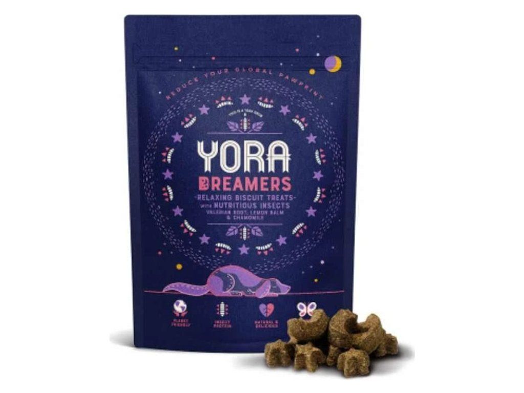 Pamlsky Yora Dreamers z hmyzího proteinu jsou jedinečné z mnoha důvodů. Hmyzí moučka jemně zapečená s ovsem, cizrnovou moukou doplněná mučenkou, rmencem, kořenem kozlíku lékařského a meduňkou tvoří pamlsky, které zklidňují úzkostné psy. Složení pamlsků Yora Dreamers pomáhá psům také relaxovat před spaním nebo v situacích, kdy se cítí nervózní. Stále více veterinářů doporučuje hmyzí protein pro psy s alergiemi na bílkoviny obsažné v běžných krmivech. Hmyzí protein nevytváří alergie a přináší velmi kvalitní a lehce vstřebatelné bílkoviny. Dávkování pamlsků upravte k denní krmné dávce vašeho psa. Dbejte na dostatečný přísun čerstvé vody.