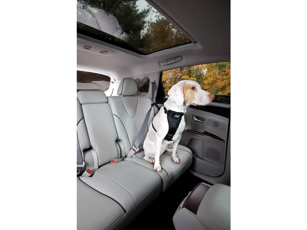 Bezpečnostní pás do auta pro psy. Pomocí karabiny připevníte pás k postroji psa a k bezpečnostnímu pásu. Upozornění: Karabinu bezpečnostního pásu připínejte vždy na popruh horní části postroje, nikdy ne na kovové kolečko (to slouží pouze na připnutí vodítka při venčení psa). Díky tomuto jednoduchému řešení cestujete se svým psím kamarádem bezpečně!