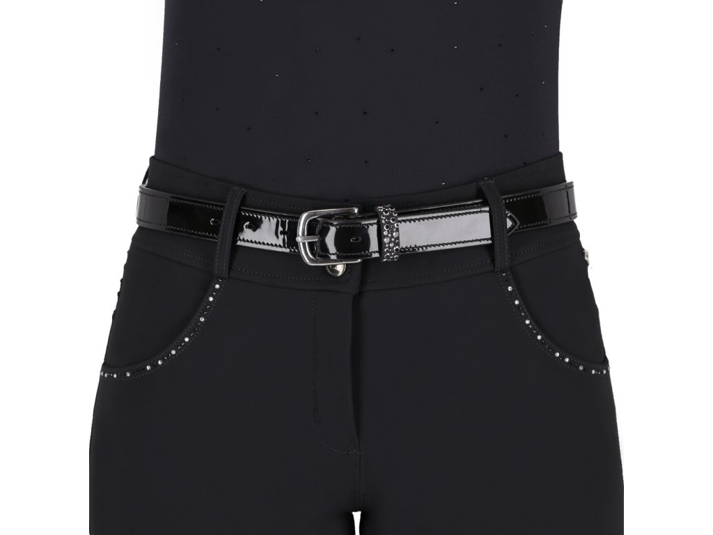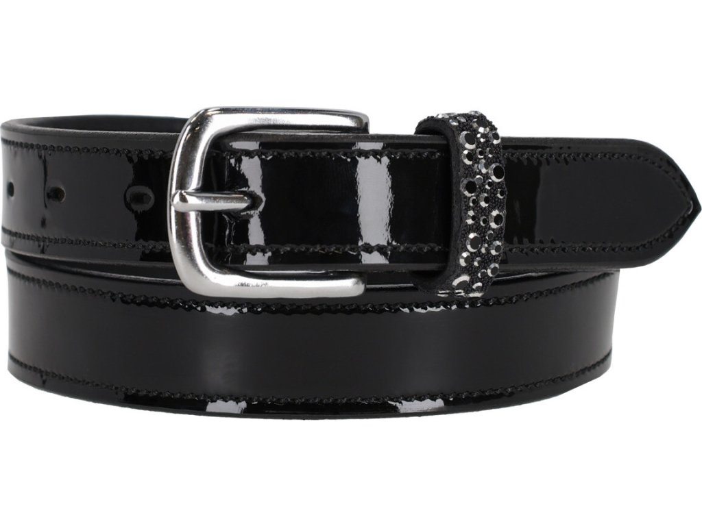 Lakovaný kožený pásek s elegantní stříbrnou přezkou z nerezové oceli. Pevné poutko je zdobené kombinací velkých i malých kamínků, což pásku dodává jemný, ale přitom výrazný detail. Díky univerzální černé barvě a klasickému designu se snadno kombinuje s různými outfity.