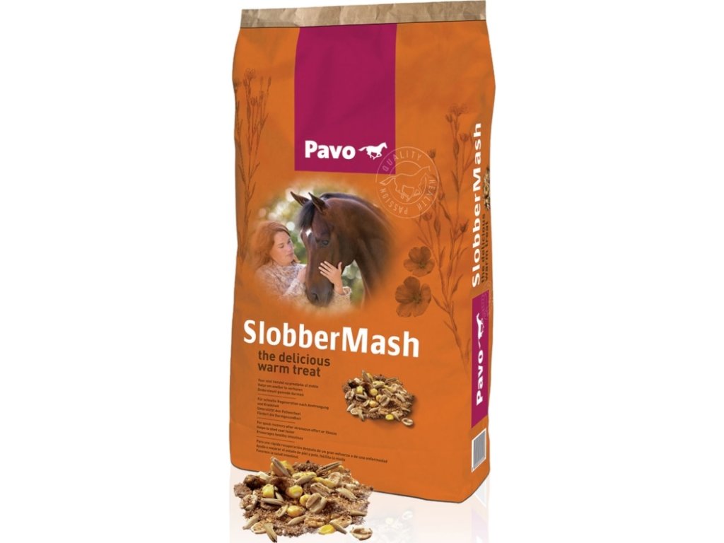 Chcete vašemu koni poskytnou opravdový požitek? Dejte mu Pavo Slobber Mash 2 – 3x týdně: extrémně chutná změna jeho krmné dávky. Odměrku Pavo Slobber Mash přelijte horkou vodou a přidejte ke krmné dávce. Díky vysoké kvalitě čistého lněného semínka dobře vybalancovaného množství vitaminů bude mít váš kůň nádhernou lesklou srst. Pavo Slobber Mash je lehce stravitelné a extrémně vhodné pro koně, kteří mají problémy se zuby. Zajišťuje rychlé zotavení po namáhavé zátěži a zlepšuje fyzickou kondici po nemoci. Pavo Slobber Mash podporuje dobré trávení, čímž snižuje možnost kolik.