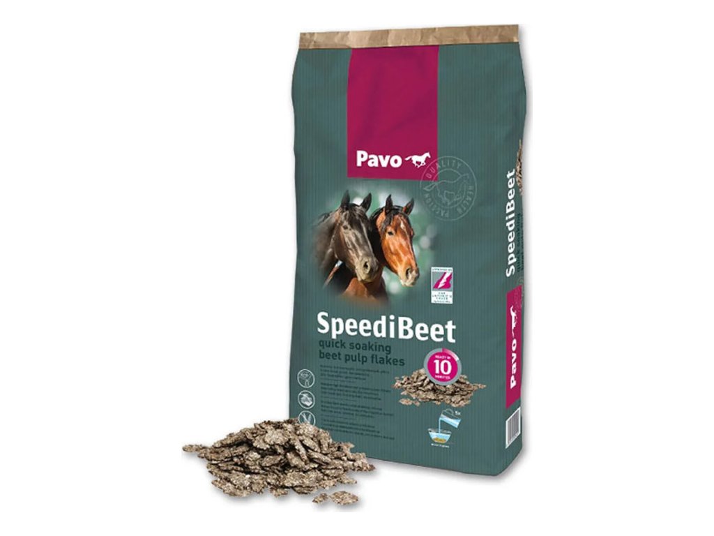 Pavo SpeediBeet se skládá z vysoce kvalitní hrubé vlákniny, která optimálně podporuje zdravé trávení. Vločky jsou zpracovány patentovaným výrobním procesem (mikronizace) do vynikajícího krmného doplňku. Tyto vločky velice rychle změknou a mohou být krmeny již po 10 minutách namáčení. Bez škrobu, melasy a s nízkým obsahem cukru jen 5 % je to ideální krmení pro koně, kteří jsou náchylní ke schvácení kopyt (Laminitis). Pavo SpeediBeet má vysoký obsah rozpustné vlákniny, hlavně pektinu, což znamená, že jeho vlákna jsou lépe stravitelná než seno. Proto je vynikajícím zdrojem energie s pomalým uvolňováním – ideální pro sportovní koně. Probiotické působení pektinu podporuje růst zdravých bakterií v trávicím traktu a zlepšuje trávení.