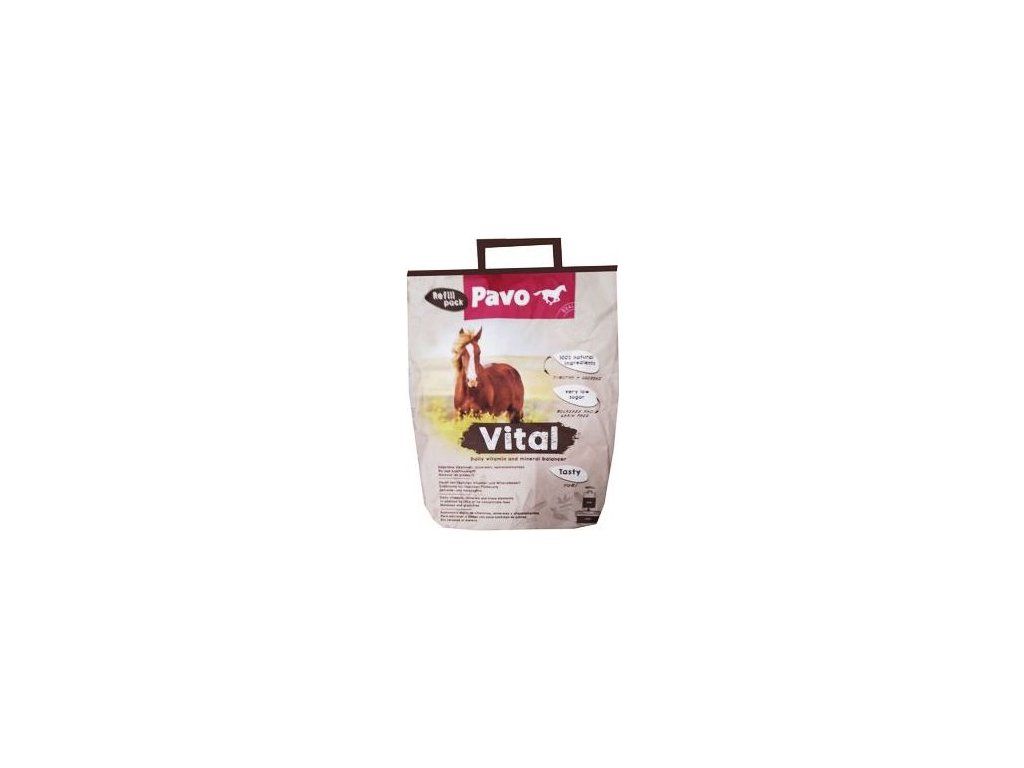 Pavo Vital je doplněk pro denní použití: granule s obsahem všech vitaminů a minerálních látek, které váš kůň potřebuje, vyrobený ze 100% přírodních surovin a neobsahuje zbytečné doplňkové látky. Pavo Vital je unikátní díky obsahu nové formy stopových prvků - Intellibond®. Normálně mají stopové prvky jako je měď a zinek pro koně špatnou chuť, a tak doplňky s obsahem těchto prvků nejsou často chutné. Ale speciální Intellibond® stopové prvky jsou rozloženy v žaludku (ne v hubě) koně. Proto nemají negativní efekt na chutnost! Společně s přídavkem bojínku lučního a vojtěšky jsou Pavo Vital velmi chutné granule!