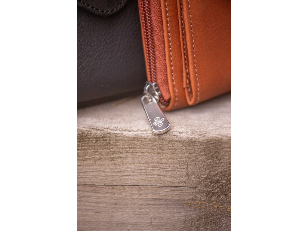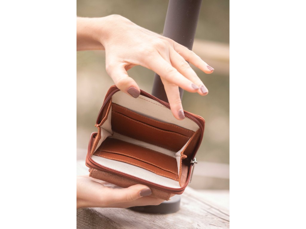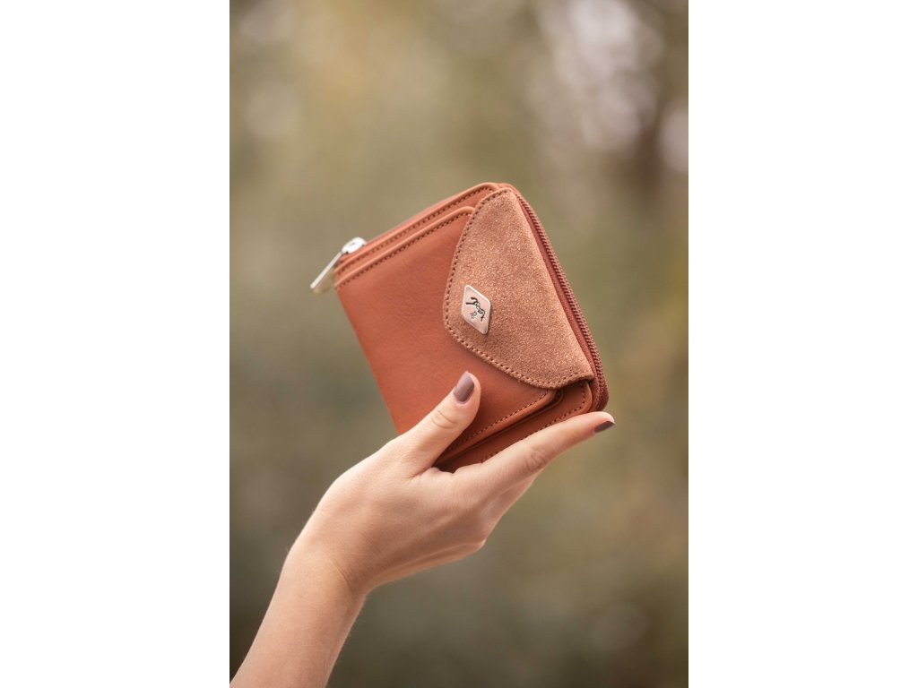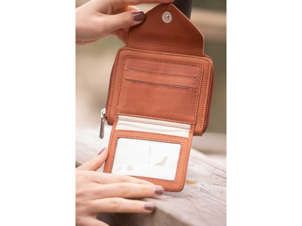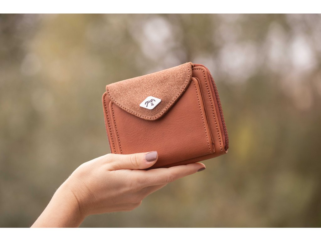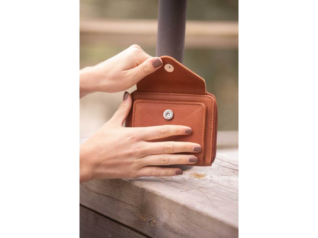 Stylová peněženka Clémence vyrobená z kvalitní hovězí kůže. Nabízí kapsu se zipem na mince a čtyři přihrádky na karty. Dále samostatnou část se zapínáním na patentku, která obsahuje další tři sloty na karty a průhledné okénko na fotografie nebo drobné dokumenty. Klopa této části je z třpytivé kůže, která dodává peněžence jedinečný šmrnc. Díky kompaktním rozměrům se snadno vejde do každé kabelky.