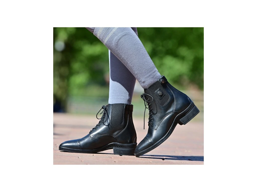 Kvalitní jezdecká pérka s elegantním ozdobným dírkováním ve stylu brogue (zdobení perforacemi do svrchní vrstvy kůže). Poskytují maximální komfort při ježdění, ale jsou vhodná i na celodenní nošení. Pérka jsou vyrobená z kvalitní evropské kůže s koženou podšívkou. Zapínání pomocí YKK ® zipu na zadní straně s krytkou a drukem. Praktické elastické vložky na stranách pro snadné nazouvání. Přední šněrování lemované koženým jazykem. Moderní profilovaná gumová podrážka absorbující nárazy se speciální vyztuží v oblasti třmenu a odnímatelnou, tvarovanou stélkou pro pohodlné nošení. K dispozici ve více velikostech.