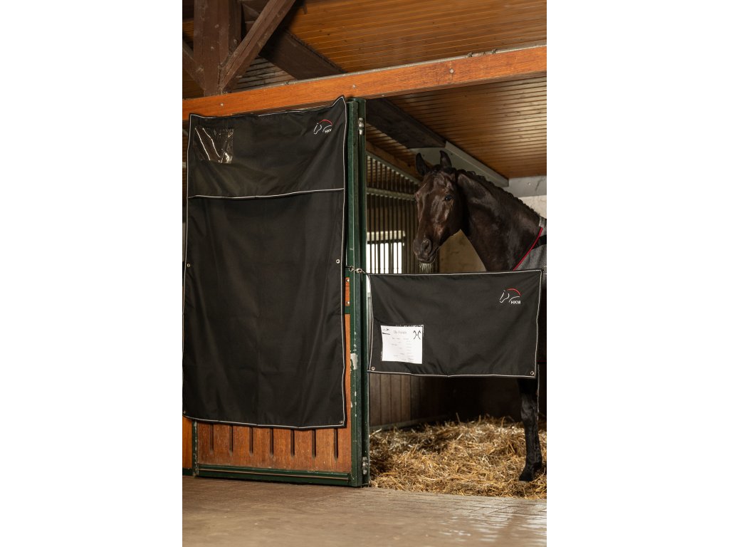 Plachta do dveří, kterou lze využít například na závodech. Vybavena dvěma kroužky a dvěma nylonovými popruhy s karabinami pro jednoduché upevnění do dveří. Do průhledného okénka lze vložit informace o koni.