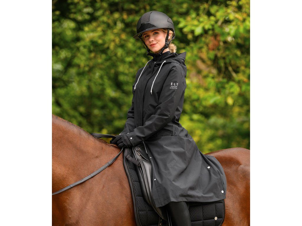 Moderní funkční jezdecká pláštěnka je ideální volbou pro všechny, kdo hledají spolehlivou ochranu i v nepříznivém počasí. Skvěle se hodí nejen při jízdě na koni, ale i pro běžné nošení. Vyniká kombinací vysoké funkčnosti, komfortu a promyšlených detailů. Rovný střih spolu s praktickým zadním rozparkem zajišťuje maximální pohodlí a volnost pohybu. Díky vodnímu sloupci 10 000 mm poskytuje výbornou ochranu proti dešti, zatímco prodyšnost 5 000 g/m²/24 h zaručuje příjemné nošení bez nadměrného pocení. Pláštěnka je větruodolná a má podlepené švy, takže vás spolehlivě ochrání i v náročnějších podmínkách. Součástí je praktická kapuce s kšiltem a stahovací šňůrkou s reflexními prvky. Kapuci lze navíc pomocí druku připnout k zádům, aby nepřekážela při jízdě. Pláštěnka je vybavena dvěma předními kapsami se zapínáním na druky, přičemž pravá kapsa je doplněna reflexním nápisem E·L·T Equestrian Performance. Další úložný prostor nabízí vnitřní kapsa na zip. Přední část zdobí druky s logem a zkrácený obousměrný zip s ochranou brady. Zadní jezdecký rozparek se zapínáním na druky a nastavitelné vnitřní popruhy na nohy zajišťují stabilitu a komfort během jízdy. Rukávy lze snadno upravit pomocí druků. Pro zvýšení bezpečnosti je pláštěnka vybavena reflexními prvky. Ideální volba pro každého, kdo chce zůstat v suchu, pohodlí a zároveň stylový.