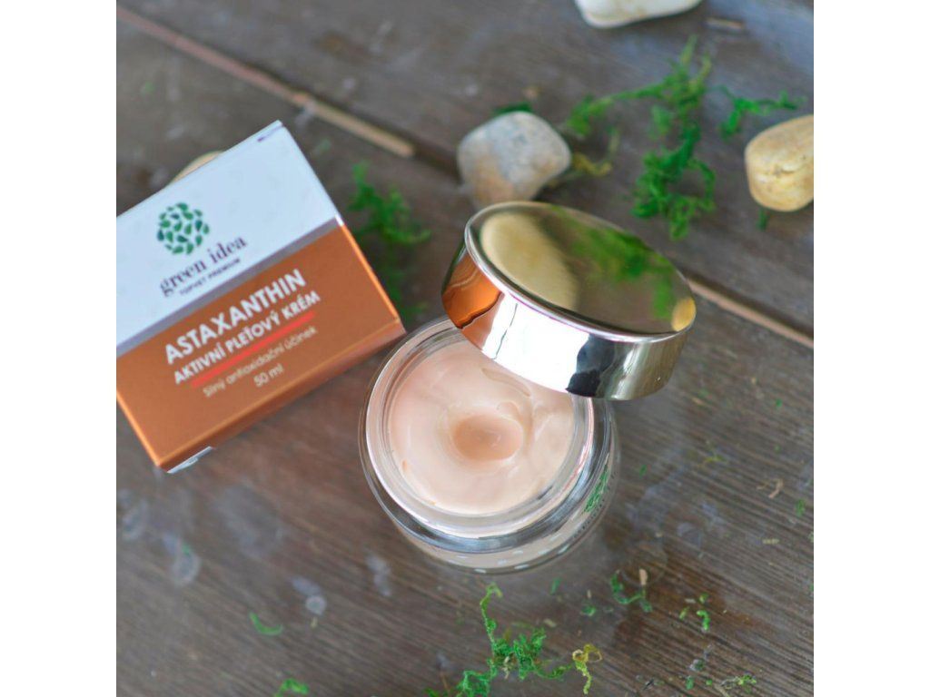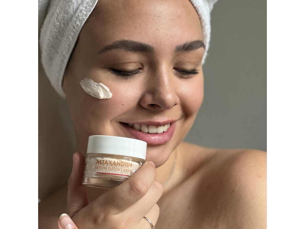 ASTAXANTHIN. Aktivní pleťový krém. Aktivní pleťový krém s astaxanthinem ze sladkovodních řas. Astaxanthin je jedním z nejsilnějších přírodních antioxidantů. Díky tomu krém plní nejen funkci bariérové ochrany pokožky, ale také aktivně působí proti vnějším vlivům prostředí. Krém rovněž pleť hydratuje, regeneruje a tlumí projevy jejího stárnutí. Pokožka zůstává mladistvá a zdravá. Astaxanthin krém je vhodné užívat v kombinaci s tobolkami Astaxanthin pro znatelnější výsledky.