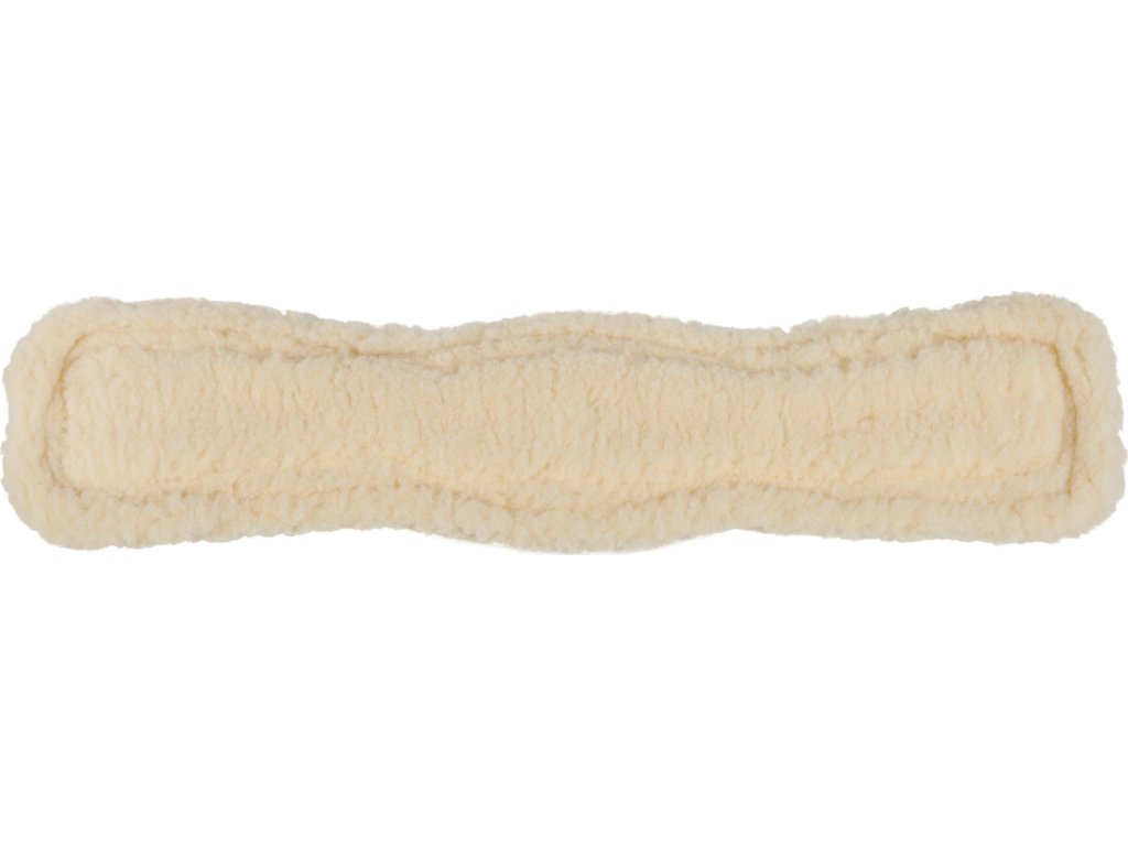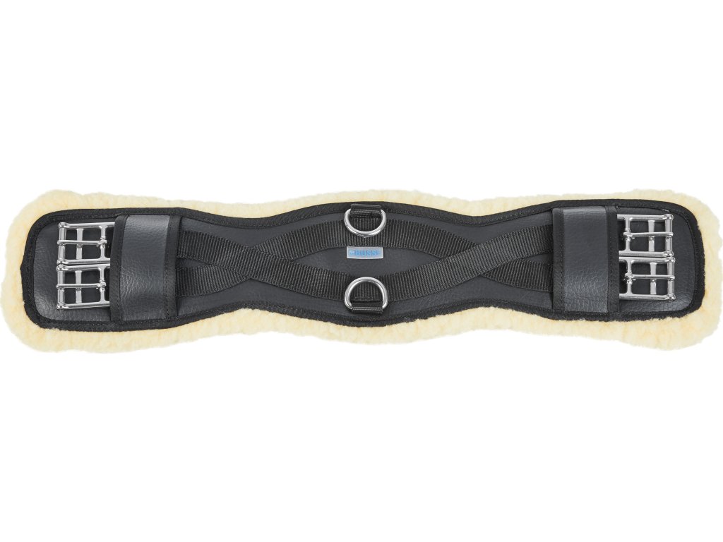 Drezurní podbřišník z umělé kůže s umělým beránkem. Zúžený v oblasti loktů pro maximální volnost pohybu, ale jinak dostatečně široký pro optimální rozložení tlaku. S nerezovými válečkovými přezkami, dvěma D-kroužky ve středu. Snadno udržovatelný díky hladkému povrchu.
