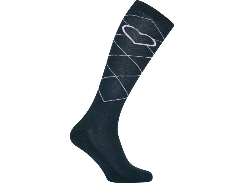 Tyto stylové podkolenky jsou dokonalým spojením pohodlí a výrazného designu. Třpytivý argylový vzor zaručí, že zaujmete na první pohled. V oblasti chodidla je materiál měkký a zajišťuje komfort i při dlouhých dnech v sedle. Zdobeny decentním vzorem srdíčka.