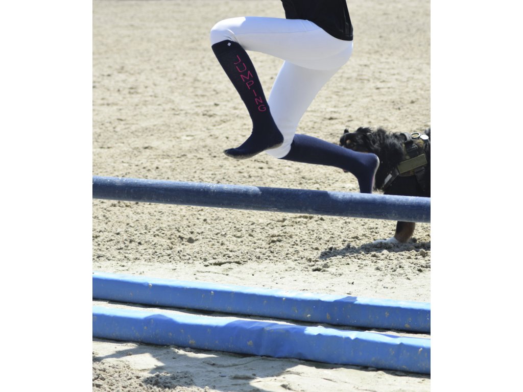 Kvalitní jezdecké podkolenky v tmavě modré barvě zaujmou výrazným růžovým nápisem Jumping, který se táhne po celé délce. Jsou vyrobeny z příjemného materiálu s vysokým podílem bavlny, který zajišťuje pohodlí a prodyšnost. Polyamid přidává odolnost a elastan se postará o pružnost a perfektní přilnutí k noze. Podkolenky skvěle padnou do jezdeckých bot a drží svůj tvar i při celodenním nošení.