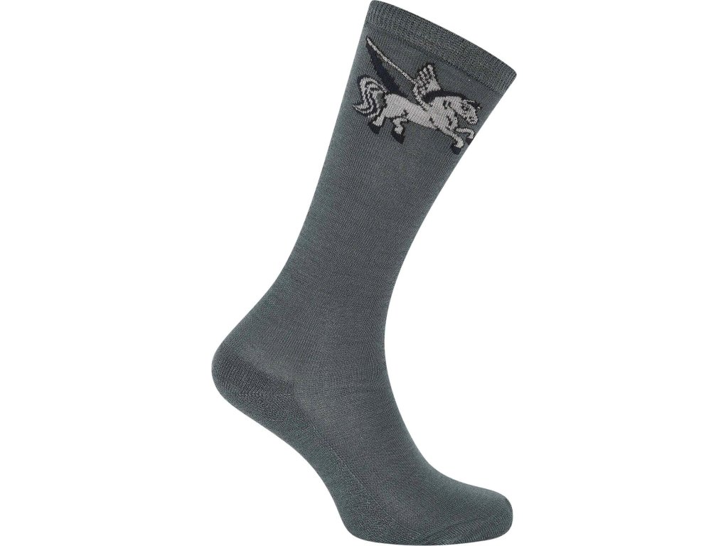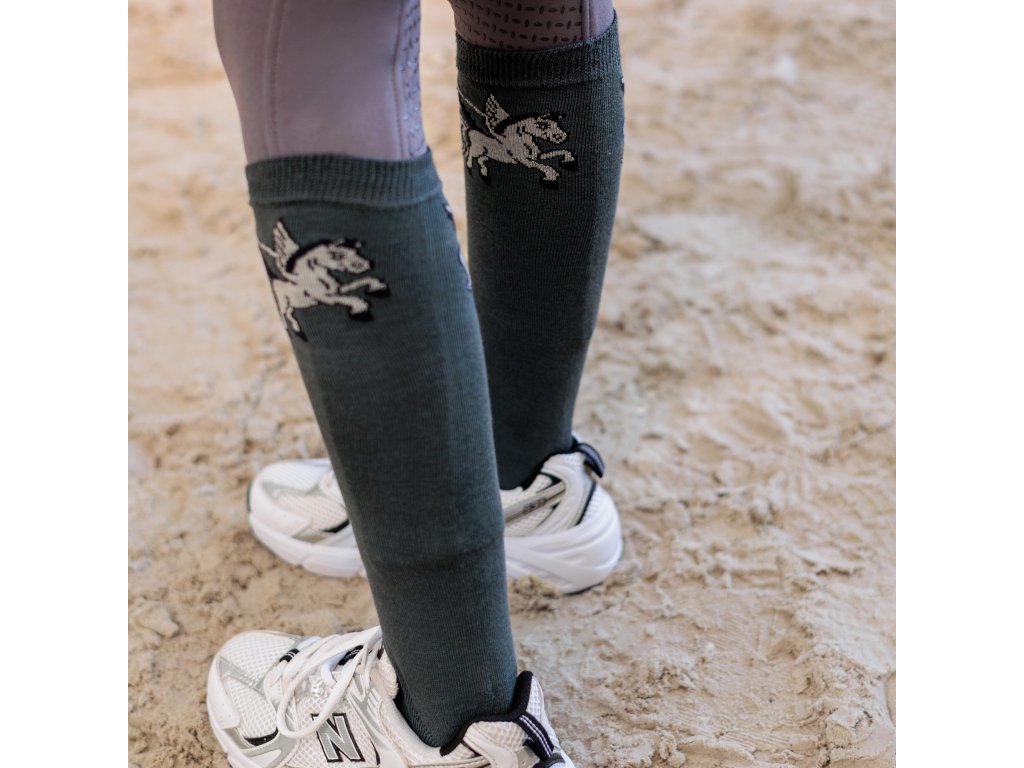 Podkolenky, které kombinují vysoký komfort, odolnost a hravý jezdecký styl. Mají vysoký střih pro pohodlné nošení v jezdeckých botách a měkký bavlněný materiál v oblasti chodidla, který zajišťuje prodyšnost a příjemný pocit po celý den. Odolný materiál je přizpůsoben nárokům aktivního jezdeckého života. Ilustrace pegase dodává podkolenkám originální vzhled.
