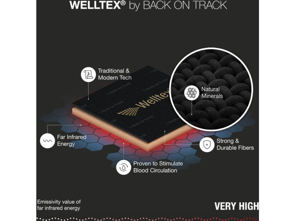Výrobce Back on Track využívá jedinečnou textilii obohacenou o keramická vlákna, kterou nazývá Welltex®. Tento materiál disponuje schopností odrážet teplo a vychází z kombinace starověkých čínských metod a moderní textilní technologie. Dr. Erland Beselin objevil způsob úlevy od bolesti inspirovaný starověkou Čínou. Tradiční metoda spočívala v aplikaci speciálního typu mramorového kamene na namožené svaly. Číňané pečlivě vybírali pouze určité druhy tohoto mramoru, které obsahovaly specifické minerály umožňující odraz tepla a pomáhající zmírnit bolest. S rostoucí poptávkou po tomto vzácném mramoru začali experimentovat s alternativními druhy jílu obsahujícími podobné minerály. Tyto jíly vypalovali a vyráběli z nich minerální destičky, které bylo možné použít stejně jako mramor. Minerální destičky se následně rozemílají na jemný prášek a za vysokých teplot se zapracovávají přímo do keramických vláken textilie. Díky tomu mají látky použité v produktech s textilii Welltex® stejný účinek jako původní minerální destičky.