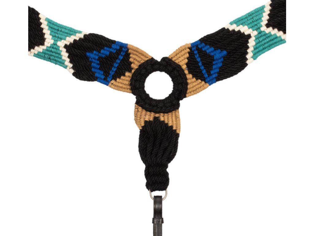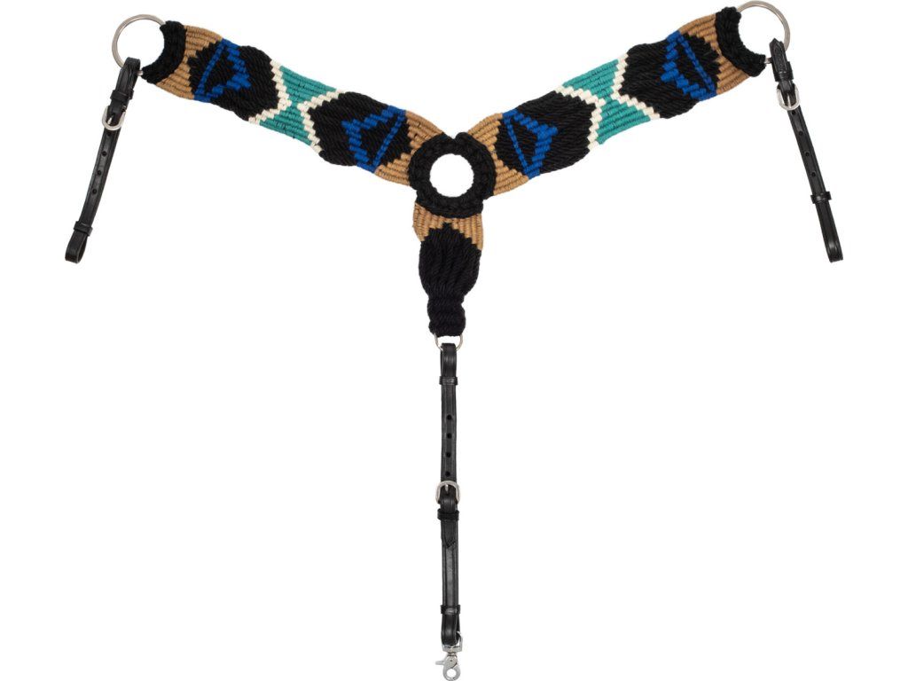 Westernový poprsník z vysoce kvalitní kůže a provazového výpletu z mohéru, který vytváří elegantní a rafinovaný design. Vybavený přezkami z nerezové oceli pro maximální odolnost a trvanlivost. Opatřený karabinou pro uchycení k podbřišníku.