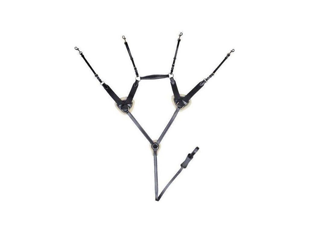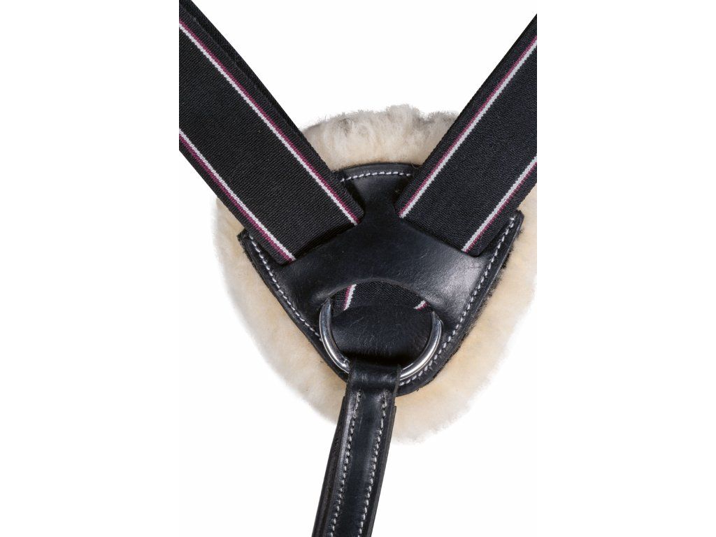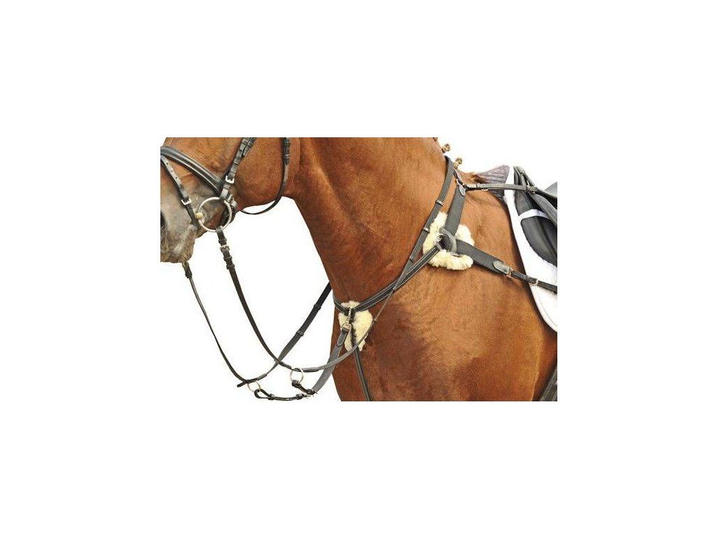 Špičkový pětibodový poprsník vyrobený z vysoce kvalitní kůže. Poprsník je plně nastavitelný a vybaven odnímatelnou martingalovou vidlicí. Opatřen odnímatelnými beránky z pravé vlny na ramenou a hrudníku, ty lze i samostatně dokoupit. Elastické popruhy poskytují větší volnost pohybu a pohodlí koně. Dostupný ve dvou barvách. Velikosti PONY, COB a FULL.