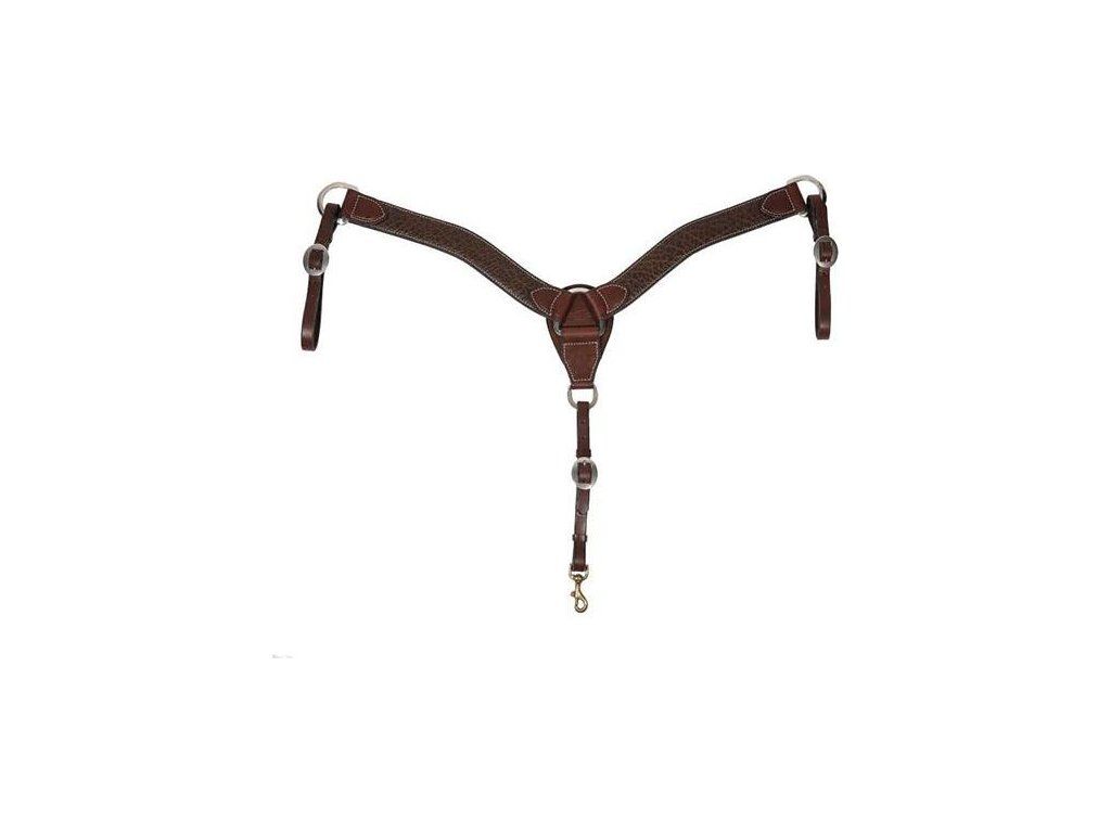 Kvalitní westernový poprsník vyrobený z bizoní kůže, která je měkká a pevnější než hovězí kůže. Vhodný na závody i pro každodenní použití. Zdobený prošíváním. Vybavený mosaznou karabinou pro pohodlné připnutí k podbřišníku. Přezky jsou z nerezové oceli.