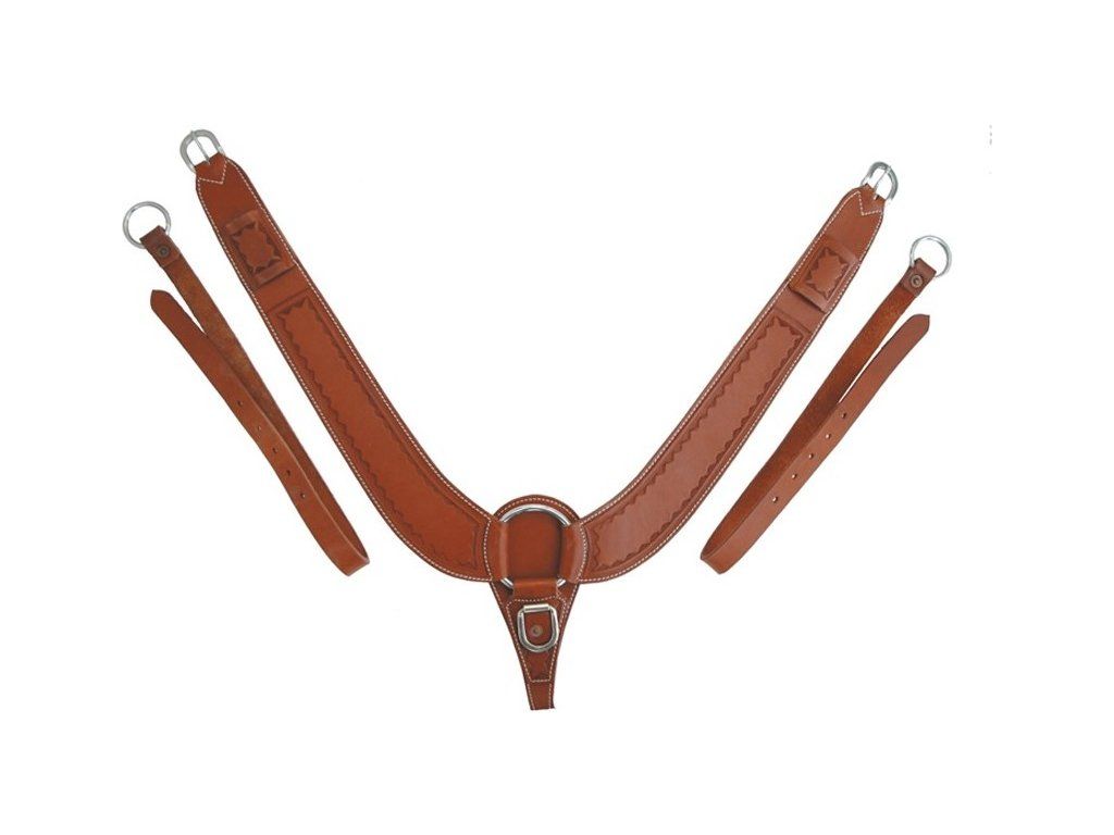 Vysoce kvalitní westernový poprsník vyrobený z kůže. Zdobený kontrastním prošíváním. Vybavený kováním ve stříbrné barvě. Ve velikosti QH.
