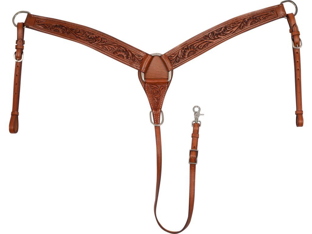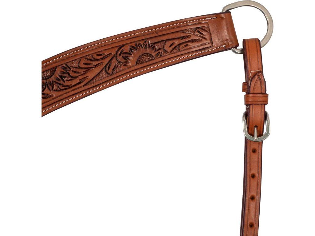 Vysoce kvalitní westernový poprsník vyrobený z kůže. Zdoben květinovým vzorem. Vybaven praktickou karabinou pro pohodlné připnutí k podbřišníku. Opatřen stříbrným kováním. Dostupný v hnědé barvě. V jedné univerzální velikosti.