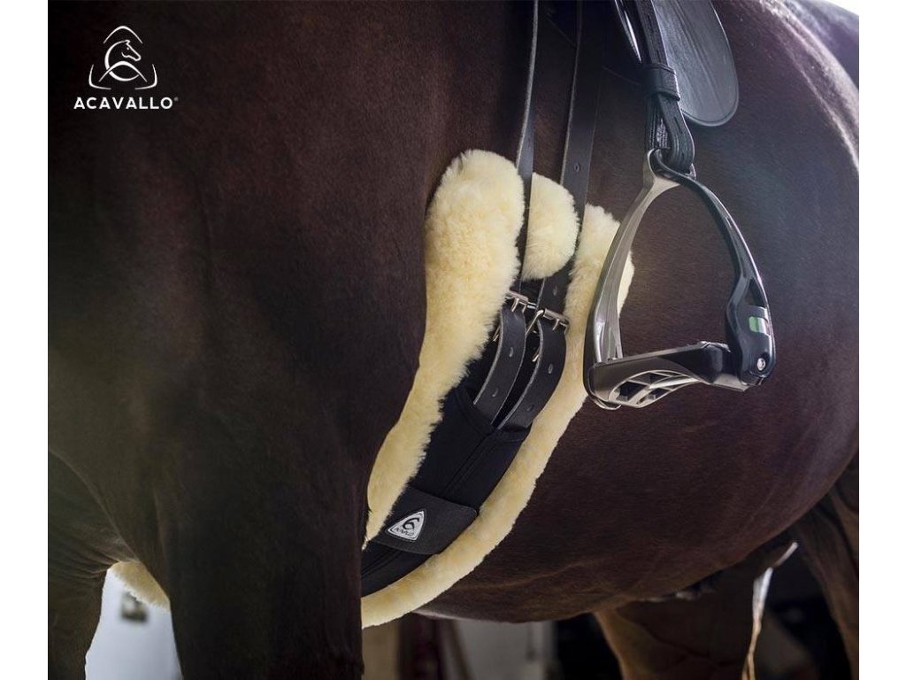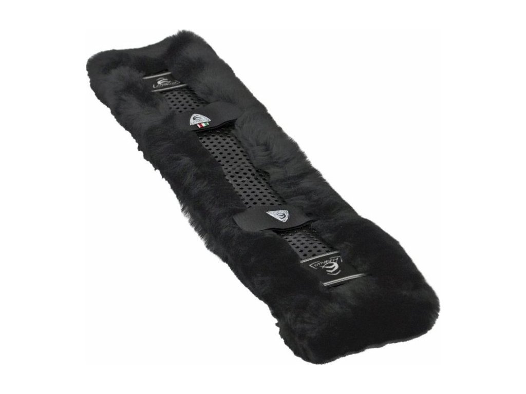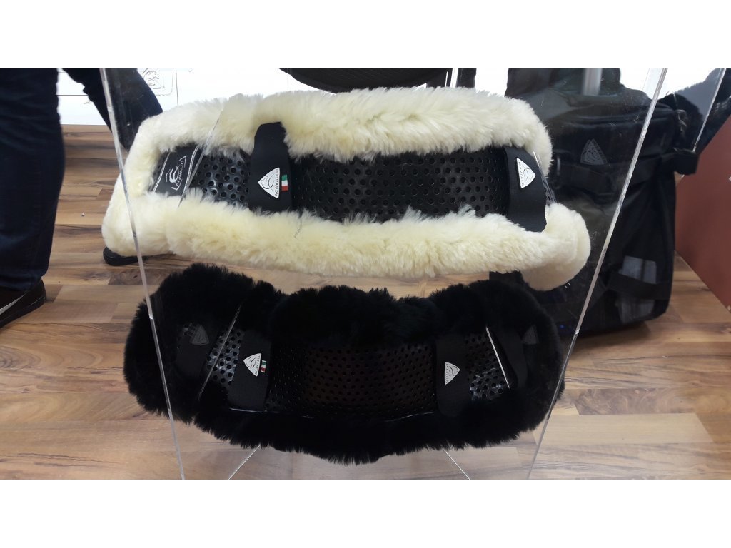 Gelový potah na podbřišník s ovčí kůží, vhodný pro koně s citlivou pokožkou nebo pokud chcete zvýšit jeho komfort, velmi pohodlný, podporuje volnost pohybu. Kožíšek je měkký, lehký a jemný, poskytuje perfektní ochranu pro citlivé oblasti pokožky, zabrání odření. Gel je silný 5 mm, což se ukázalo jako ideální tloušťka, uprostřed je silnější kvůli většímu tlaku a výraznému tření. Gel je protiskluzový, tlumí nárazy, je velmi odolný, ale zároveň pružný. Upevnění pomocí suchého zipu a provlečení elastickými poutky. Ideální na krátké rovné podbřišníky.
