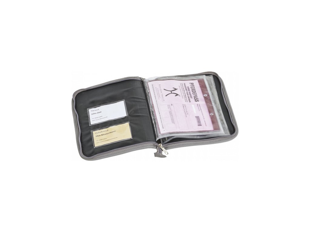 Praktické pouzdro na uložení veškerých dokladů s bezpečným zapínáním na zip. Pouzdro má čtyři průhledné kapsy na koňské průkazy a dvě malé kapsičky na vizitky v přední části. Vyrobeno z velmi pevného, snadno udržovatelného materiálu (polyester).