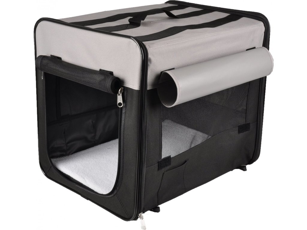 Lehká látková přepravka pro Vaše čtyřnohé miláčky s železnou konstrukcí. Boční strany jsou vybaveny průhlednou síťovinou, kterou je možné zakrýt. Barevné provedení je černo-šedé. Rozměr: 64x46x53 cm.