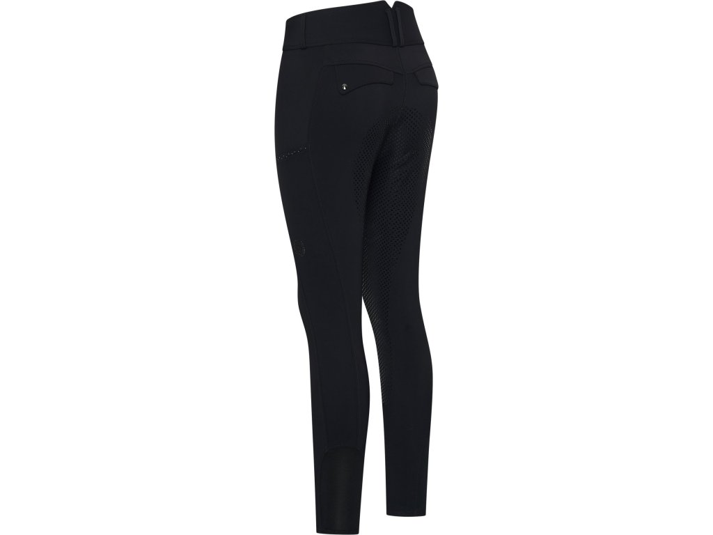 Zimní jezdecké rajtky, které jsou vyrobeny z měkké tkaniny s česanou vnitřní vrstvou, která vás dokonale zahřeje i během chladných dnů ve stáji či při zimních trénincích. Čtyřsměrný strečový materiál umožňuje maximální volnost pohybu a pohodlí, zatímco silikonový grip podél celé délky sedu zajistí stabilní sed v sedle. Mají poutka na opasek a kapsu na telefon podél stehna. Zdobeny decentními kamínky. Vysoký pas se zapínáním na dva knoflíky podtrhuje ženskou siluetu a poskytuje pohodlí při jízdě.