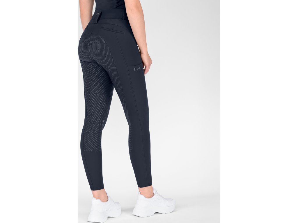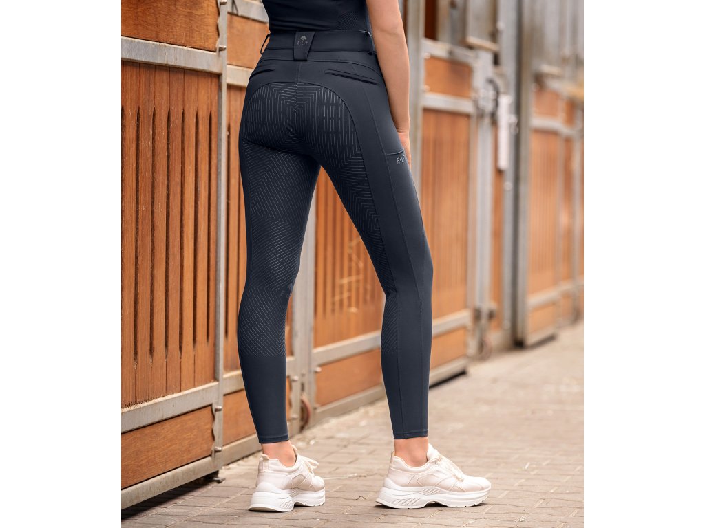 Kvalitní rajtky, které nabízejí nejen elegantní vzhled, ale především pohodlí při jízdě i běžném nošení. Silikonový grip po celé délce s integrovaným logem E·L·T zajišťuje optimální přilnavost v sedle a maximální stabilitu. Rajtky jsou vyrobeny z bi-elastického, prodyšného a vodoodpudivého materiálu s obsahem recyklovaných vláken, což z nich činí nejen funkční, ale i udržitelnou volbu. K praktickým detailům patří boční kapsa na mobilní telefon, dvě šikmé kapsy s jemným saténovým lemováním a poutka na opasek. Zdobí je stříbrný potisk loga E·L·T na zadním poutku a kvalitní kovový štítek s logem značky.