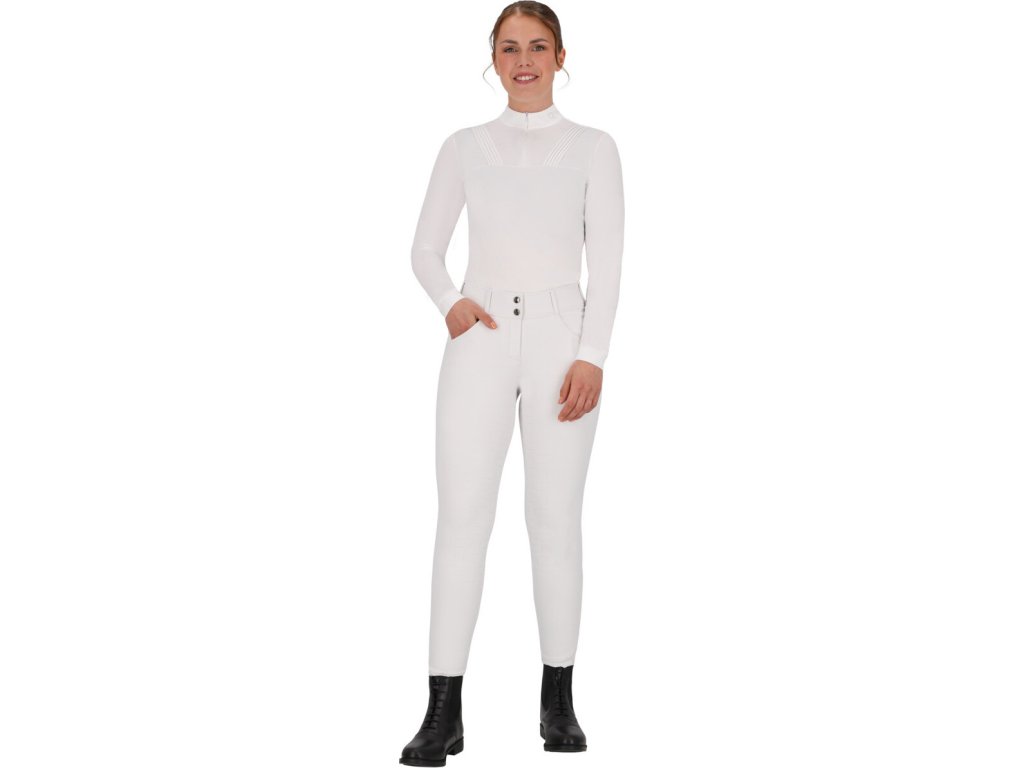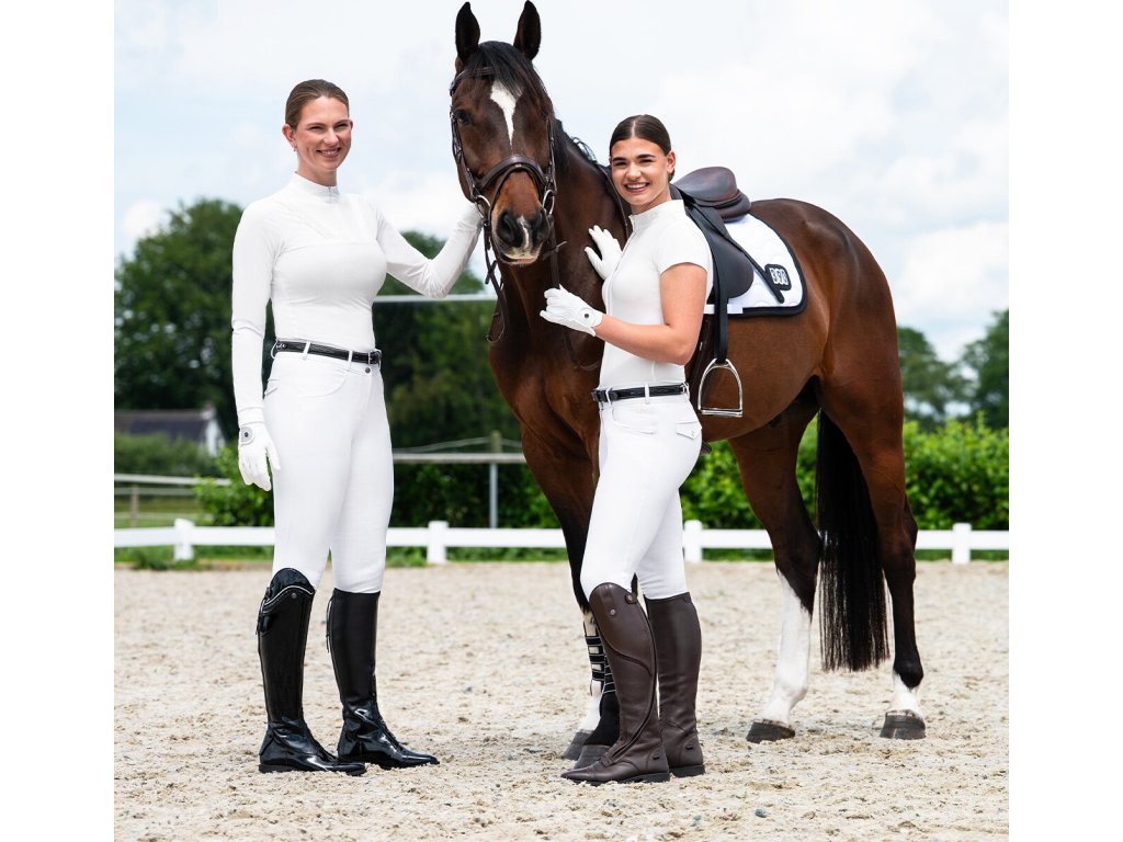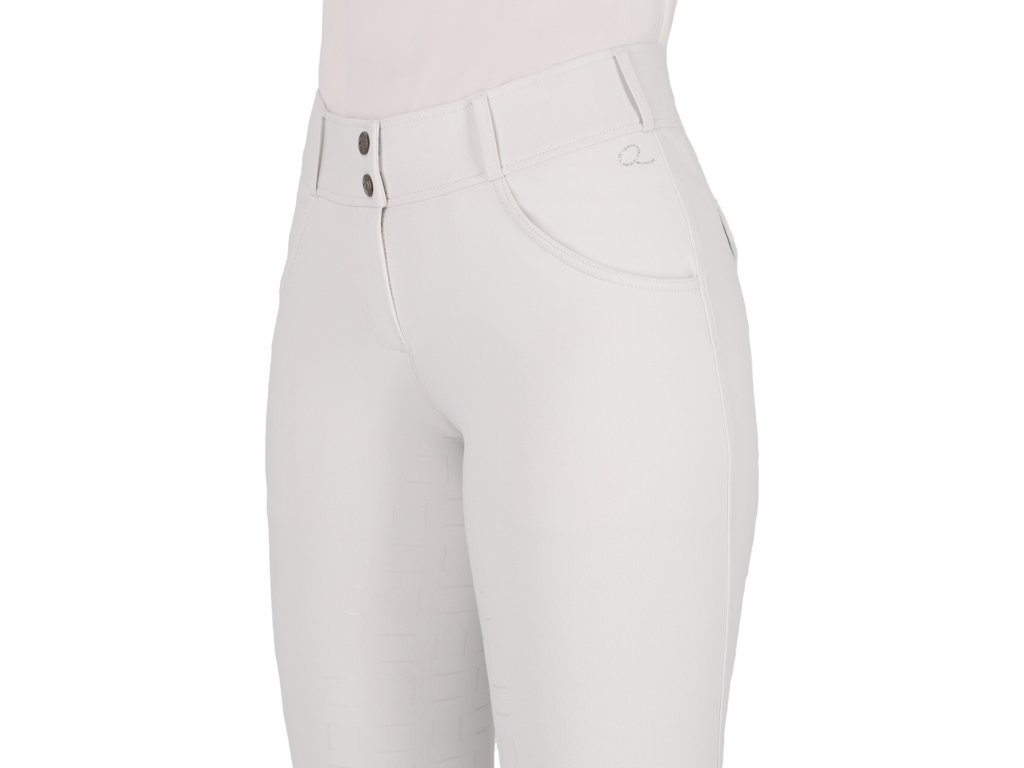 Dámské závodní rajtky z mimořádně měkké, prodyšné a čtyřsměrně strečové látky, která se dokonale přizpůsobí pohybu a poskytuje maximální komfort při nošení. Materiál je tvarově stálý, zachovává si svůj vzhled a díky husté struktuře neprosvítá. Grip po celé délce sedu zajišťuje lepší stabilitu v sedle. Rajtky jsou zakončeny elastickou síťovinou na nohavicích. Design doplňují ozdobné zadní kapsy s jemným kamínkovým detailem. Rajtky jsou vhodné pro celoroční použití. Lze prát v pračce na 30 stupňů. Nepoužívejte raději změkčovač tkanin a nesušte v sušičce.
