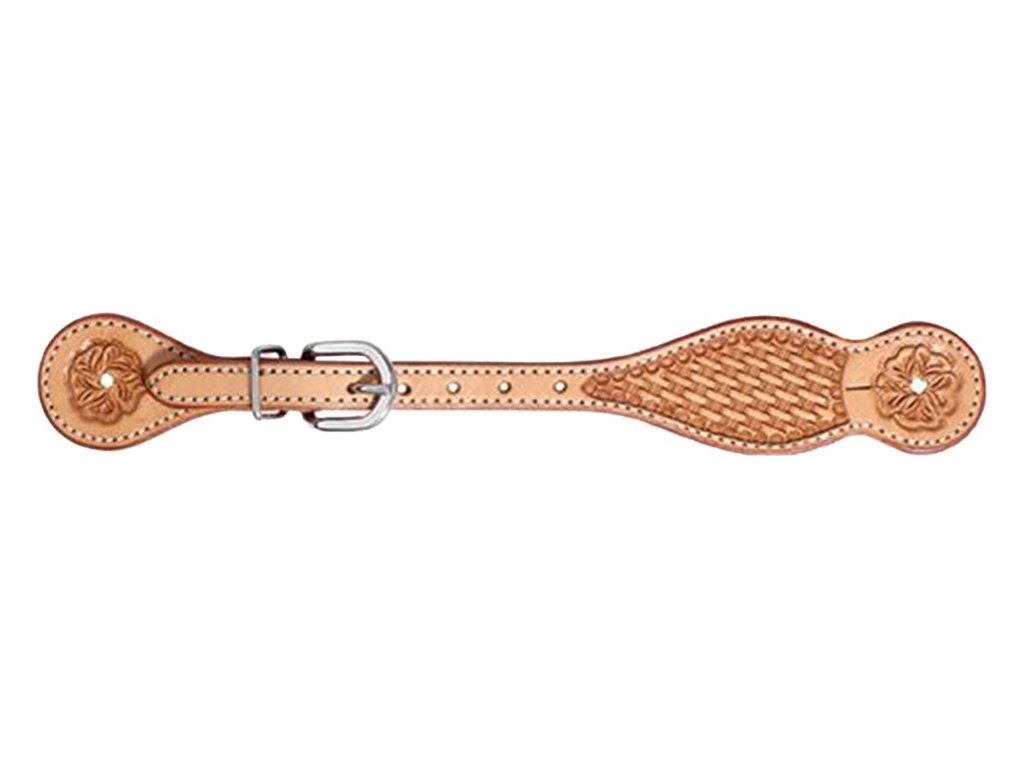 Řemínky k westernovým ostruhám vyrobeny z kvalitní kůže. Vybaveny přezkami z nerezové oceli. Zdobeny basket vzorem.
