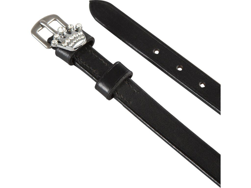 Řemínky ke špornám vyrobené z vysoce kvalitní kůže pro zajištění maximální odolnosti v průběhu času. Jsou nastavitelné, aby perfektně seděly na ostruhu a umožňovaly pohodlí a stabilitu. Spona je stříbrné barvy. Zdobeny třpytivou korunkou. Vhodné pro všechny typy anglických ostruh. Dodávané v páru. K dispozici ve více variantách. Vyráběny v jedné velikosti.