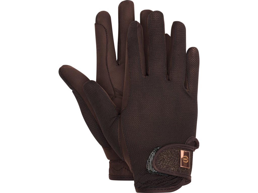 Tyto rukavice byly navrženy pro maximální pohodlí a styl během teplých letních dnů v sedle. Jsou vyrobené z vysoce prodyšného síťovaného materiálu, který umožňuje volný průchod vzduchu a udržuje ruce chladné a suché i při intenzivním tréninku. Rychleschnoucí tkanina zajišťuje pocit svěžesti a komfortu po celou dobu nošení. Materiál v oblasti dlaně z jemné syntetické kůže poskytuje spolehlivý úchop otěží a jistotu při každém pohybu. Díky elastickému materiálu v oblasti zápěstí a nastavitelnému zapínání na suchý zip rukavice dokonale padnou. Stylový prvek v podobě třpytivého detailu s kovovou destičkou dodává rukavicím elegantní vzhled.